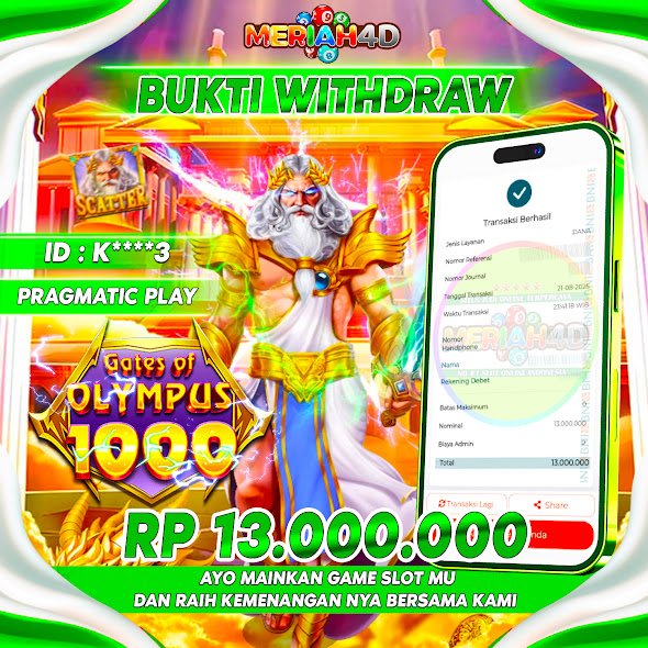 Selamat Kepada ID : K****3 Atas Withdraw Rp. 13.000.000 Juta Hari ini. Ditunggu Withdraw Selanjutnya dan ajak juga teman temannya bergabung di Meriah4d