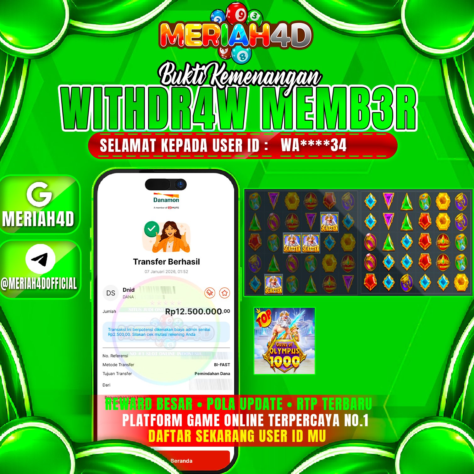 Selamat Kepada ID : WA******34 Atas Withdraw Rp. 12.500.000 Juta Hari ini. Ditunggu Withdraw Selanjutnya dan ajak juga teman temannya bergabung di Meriah4d