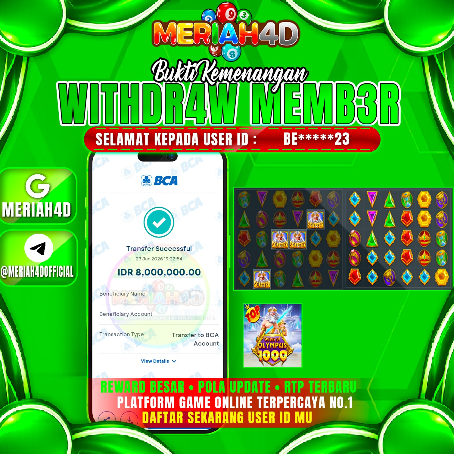 Selamat Kepada ID : BE******23 Atas Withdraw Rp. 8.000.000 Juta Hari ini. Ditunggu Withdraw Selanjutnya dan ajak juga teman temannya bergabung di Meriah4d