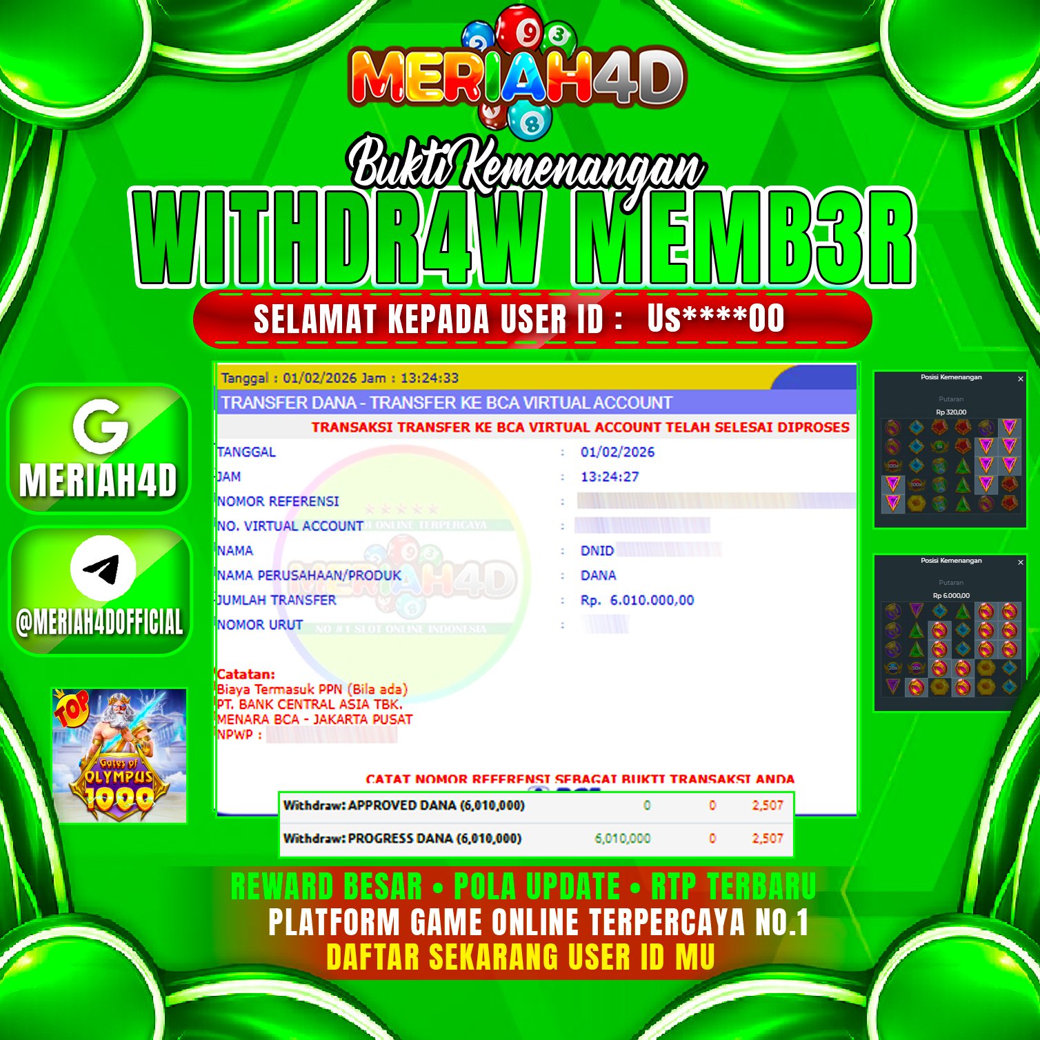 Selamat Kepada ID : US****00 Atas Withdraw Rp. 6.010.000 Juta Hari ini. Ditunggu Withdraw Selanjutnya dan ajak juga teman temannya bergabung di Meriah4d