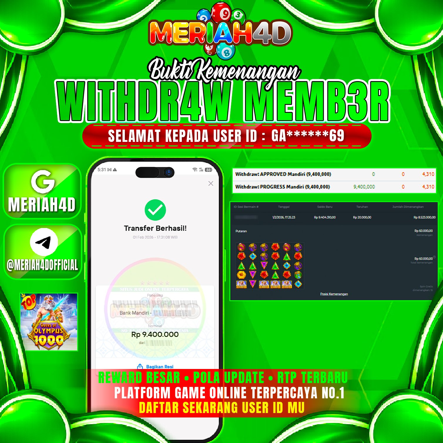 Selamat Kepada ID : GA******69 Atas Withdraw Rp. 9.400.000 Juta Hari ini. Ditunggu Withdraw Selanjutnya dan ajak juga teman temannya bergabung di Meriah4d
