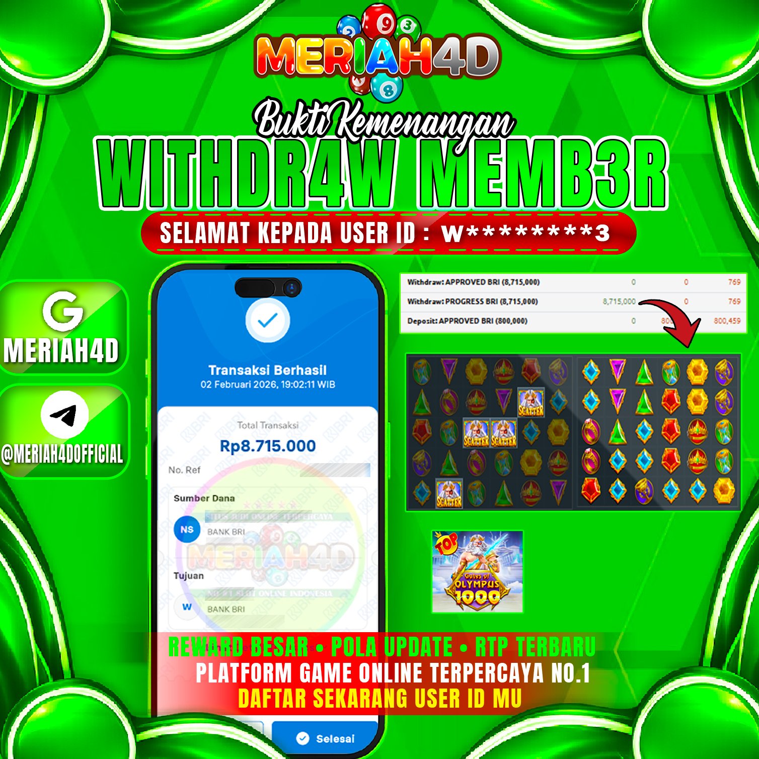 Selamat Kepada ID : W****3 Atas Withdraw Rp. 8.715.000 Juta Hari ini. Ditunggu Withdraw Selanjutnya dan ajak juga teman temannya bergabung di Meriah4d