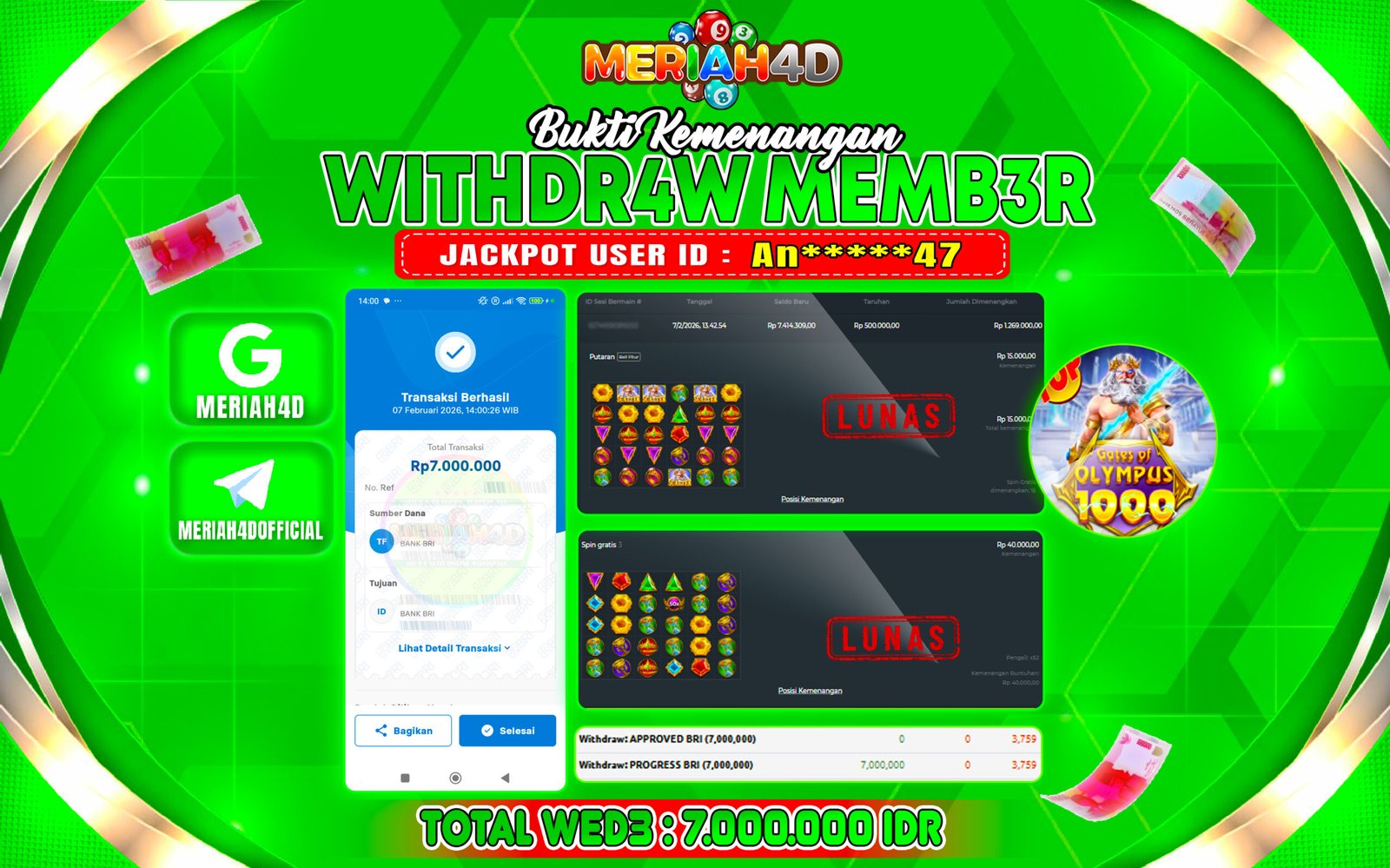Selamat Kepada ID : an*****47 Atas Withdraw Rp. 7.000.000 Juta Hari ini. Ditunggu Withdraw Selanjutnya dan ajak juga teman temannya bergabung di Meriah4d