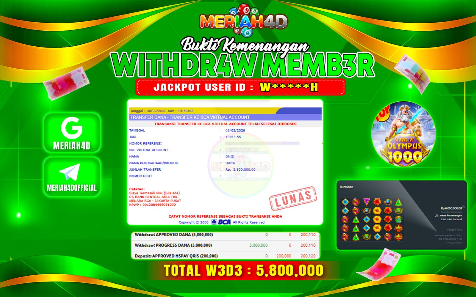 Selamat Kepada ID : W******H Atas Withdraw Rp. 5.800.000 Juta Hari ini. Ditunggu Withdraw Selanjutnya dan ajak juga teman temannya bergabung di Meriah4d