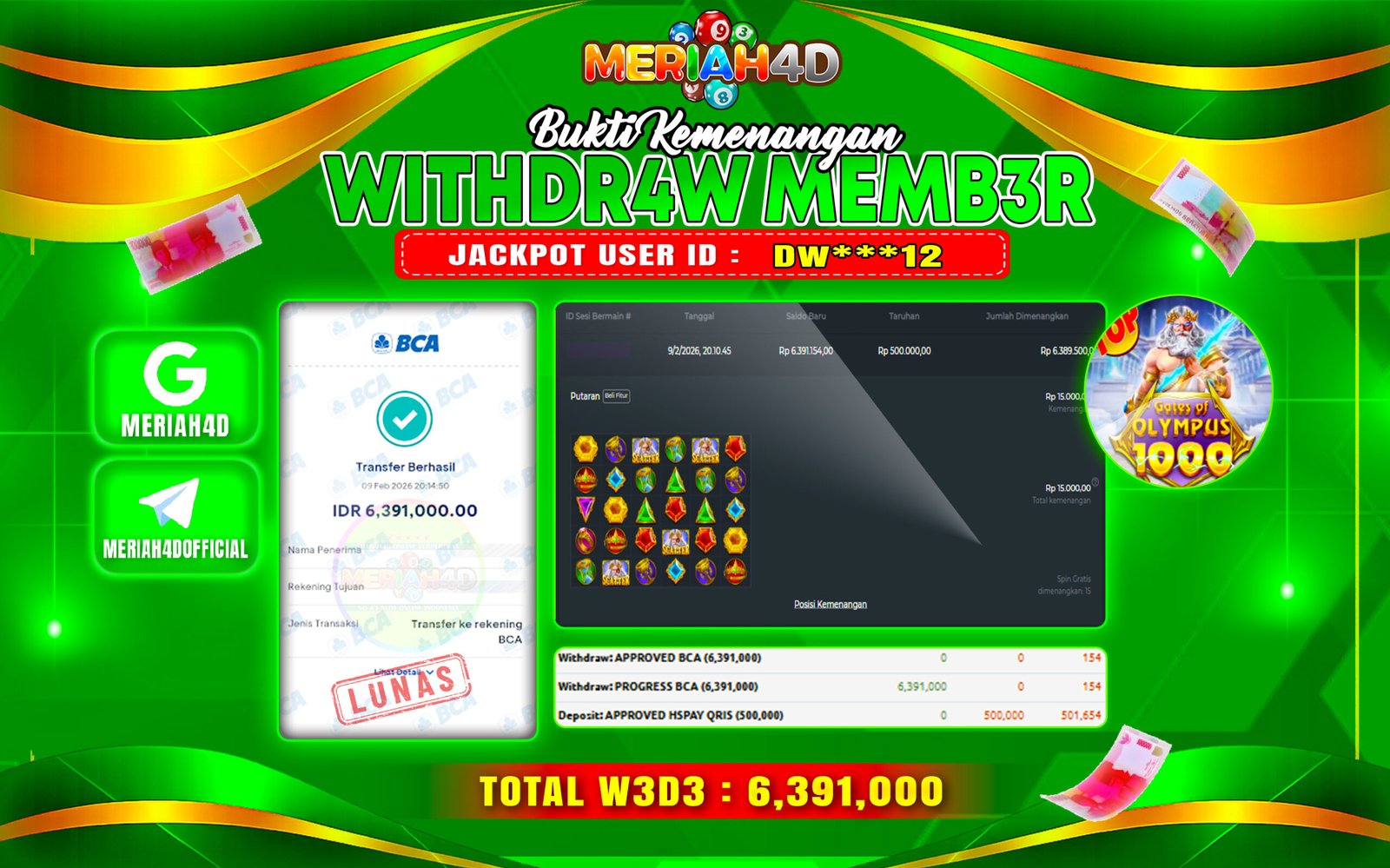 Selamat Kepada ID : DW******12 Atas Withdraw Rp. 6.391.000 Juta Hari ini. Ditunggu Withdraw Selanjutnya dan ajak juga teman temannya bergabung di Meriah4d