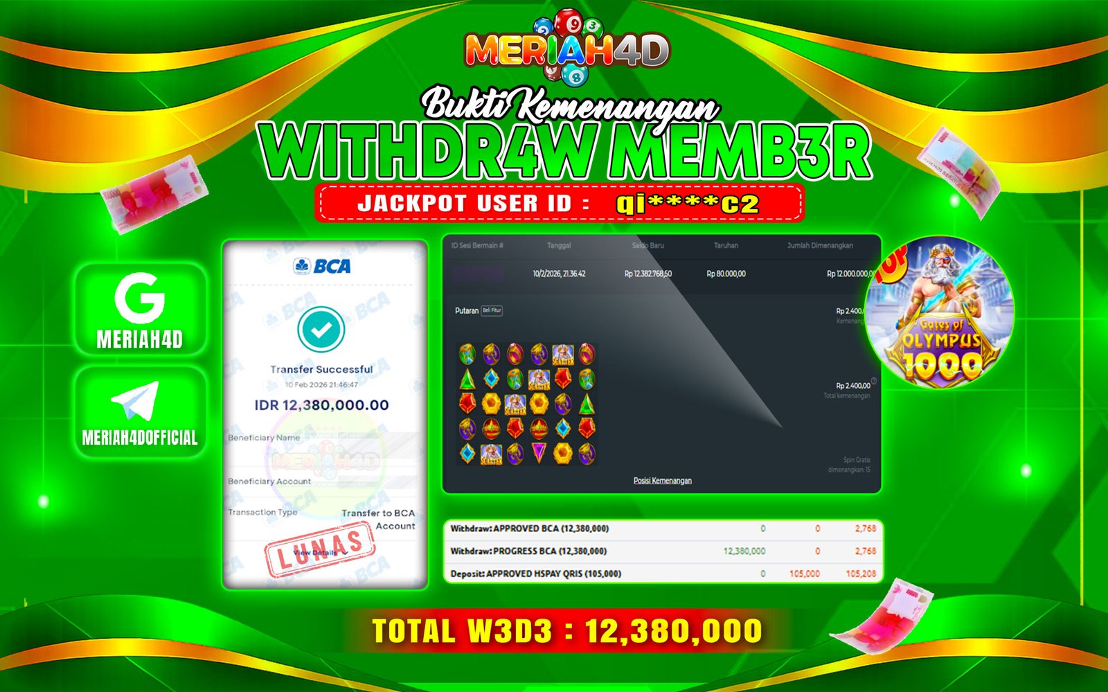 Selamat Kepada ID : QI*****C2 Atas Withdraw Rp. 12.380.000 Juta Hari ini. Ditunggu Withdraw Selanjutnya dan ajak juga teman temannya bergabung di Meriah4d