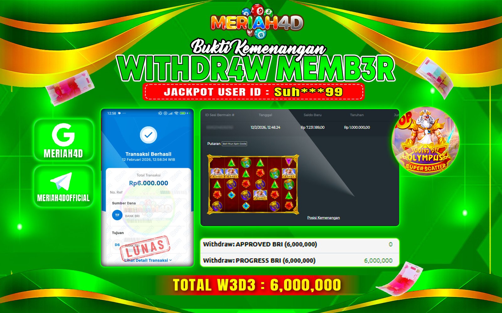 Selamat Kepada ID : SUH***99 Atas Withdraw Rp. 6.000.000 Juta Hari ini. Ditunggu Withdraw Selanjutnya dan ajak juga teman temannya bergabung di Meriah4d