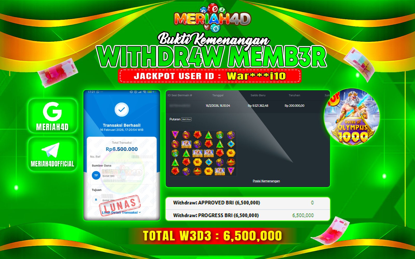 Selamat Kepada ID : WAR***I10 Atas Withdraw Rp. 6.500.000 Juta Hari ini. Ditunggu Withdraw Selanjutnya dan ajak juga teman temannya bergabung di Meriah4d