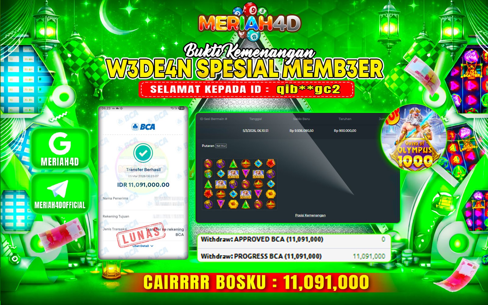 Selamat Kepada ID : QIB**GC2 Atas Withdraw Rp. 11.091.000 Juta Hari ini. Ditunggu Withdraw Selanjutnya dan ajak juga teman temannya bergabung di Meriah4d