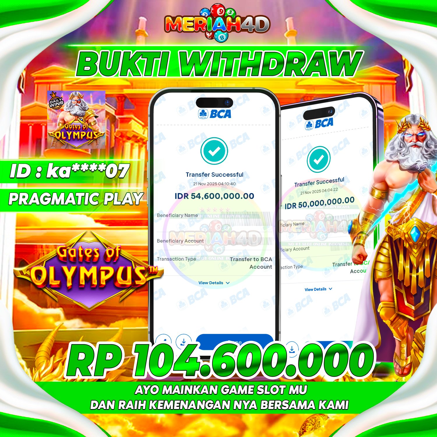 Selamat Kepada ID : KA*******07 Atas Withdraw Rp. 104.600.000 Juta Hari ini. Ditunggu Withdraw Selanjutnya dan ajak juga teman temannya bergabung di Meriah4d