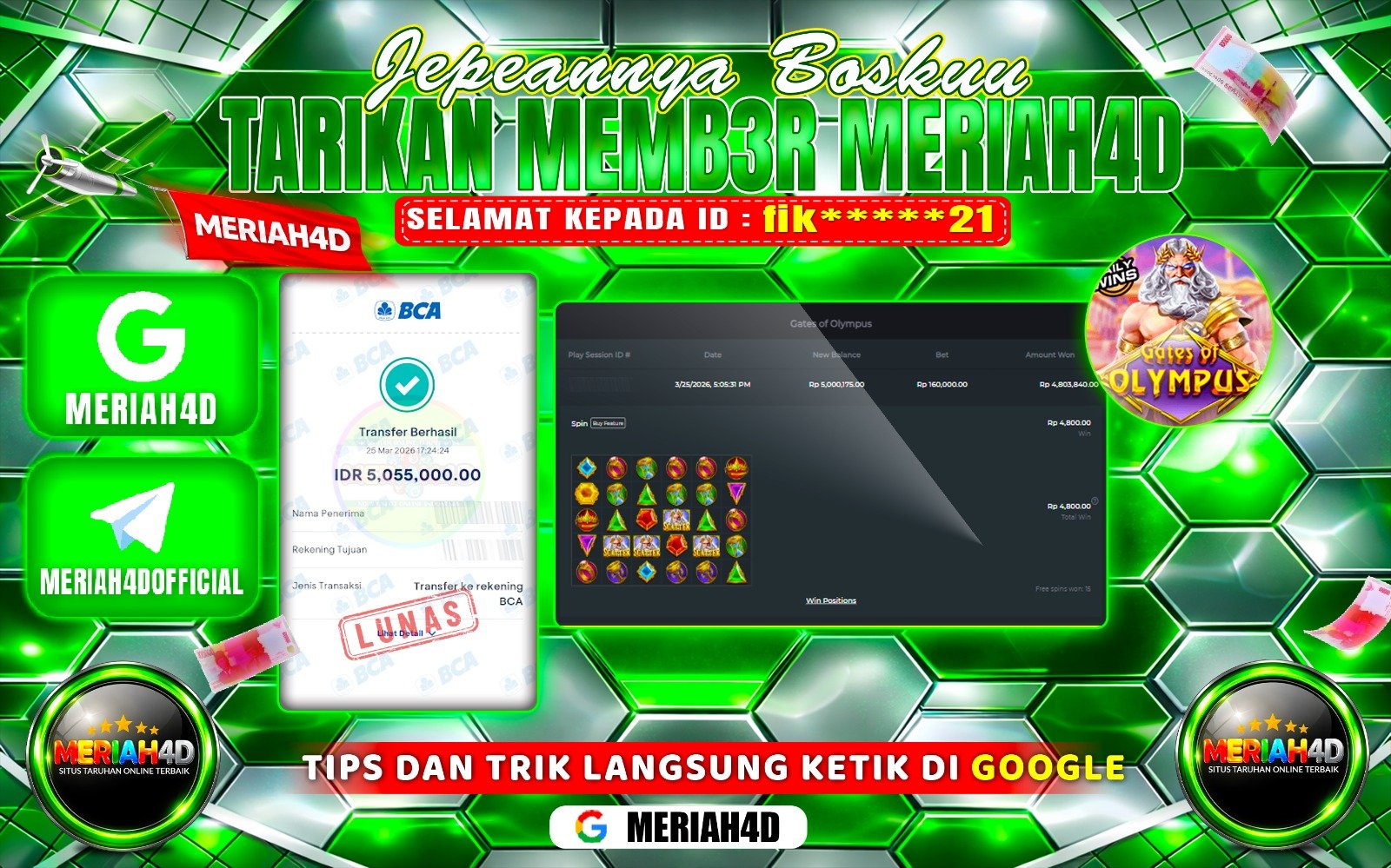 Selamat Kepada ID : fik*****21 Atas Withdraw Rp. 5.055.000 Juta Hari ini. Ditunggu Withdraw Selanjutnya dan ajak juga teman temannya bergabung di Meriah4d