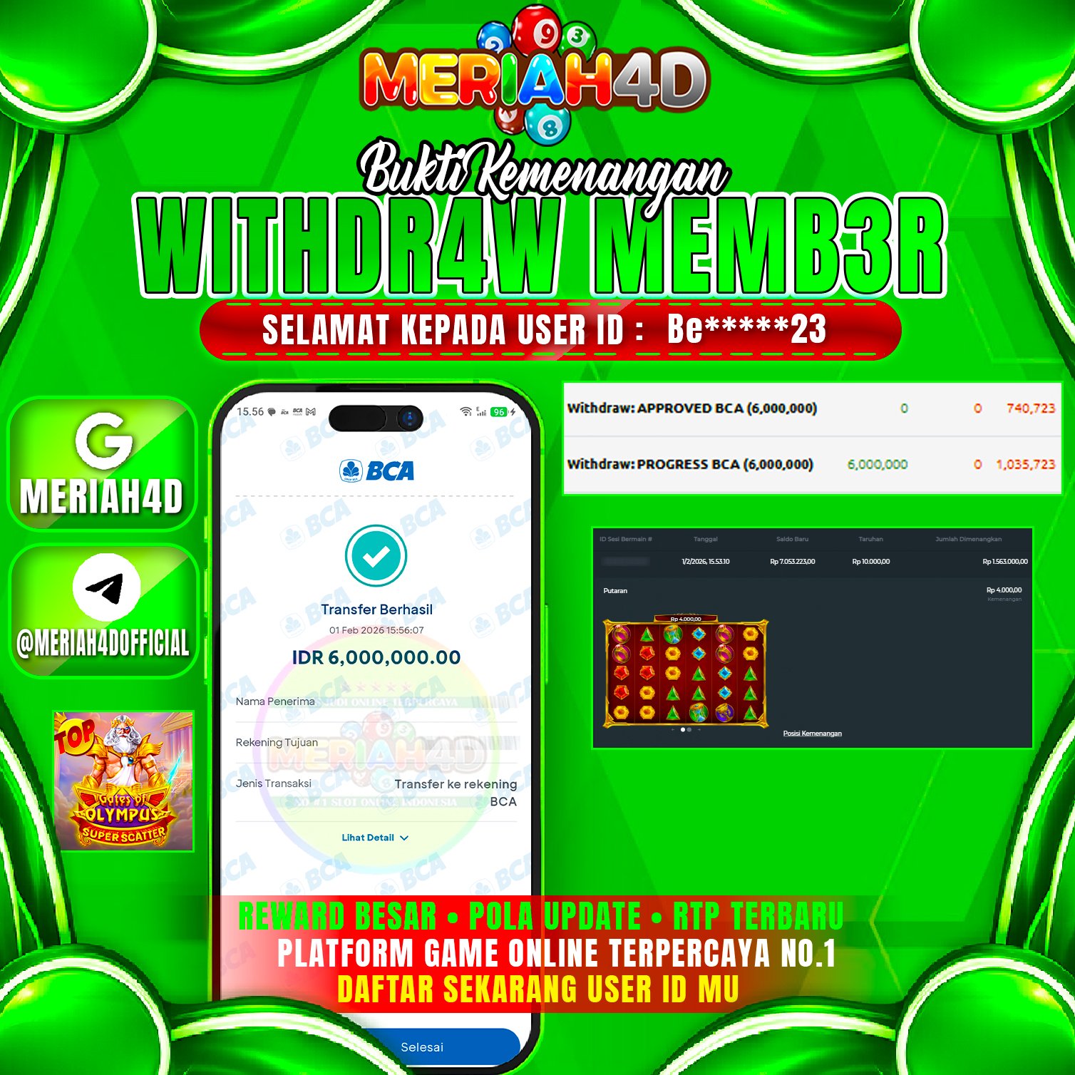 Selamat Kepada ID : BE*****23 Atas Withdraw Rp. 6.000.000 Juta Hari ini. Ditunggu Withdraw Selanjutnya dan ajak juga teman temannya bergabung di Meriah4d
