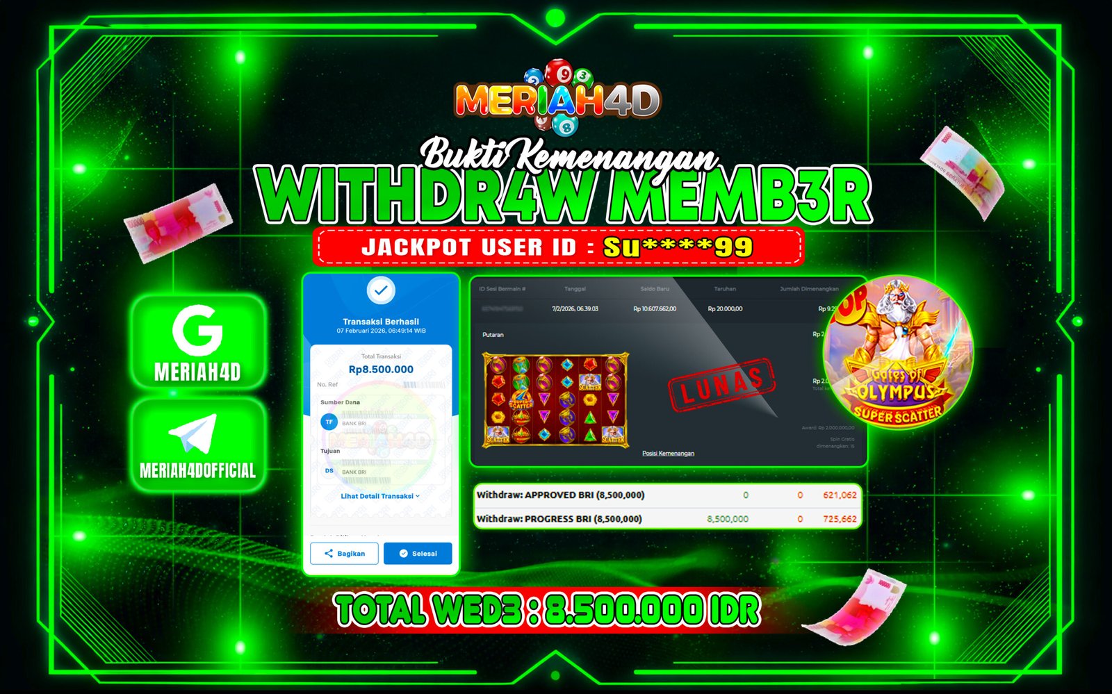 Selamat Kepada ID : SU****99 Atas Withdraw Rp. 8.500.000 Juta Hari ini. Ditunggu Withdraw Selanjutnya dan ajak juga teman temannya bergabung di Meriah4d