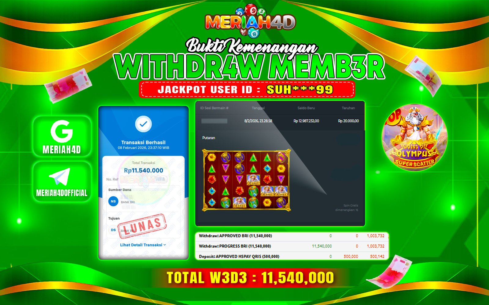 Selamat Kepada ID : SUH******99 Atas Withdraw Rp. 11.540.000 Juta Hari ini. Ditunggu Withdraw Selanjutnya dan ajak juga teman temannya bergabung di Meriah4d