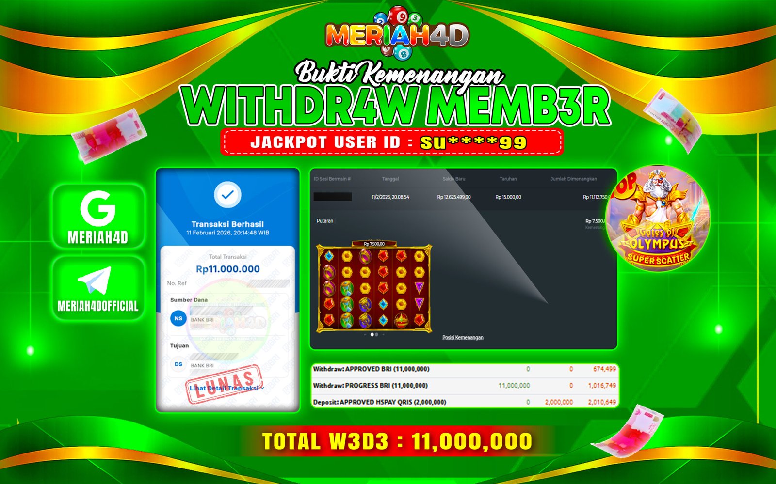 Selamat Kepada ID : SU****99 Atas Withdraw Rp. 11.000.000 Juta Hari ini. Ditunggu Withdraw Selanjutnya dan ajak juga teman temannya bergabung di Meriah4d