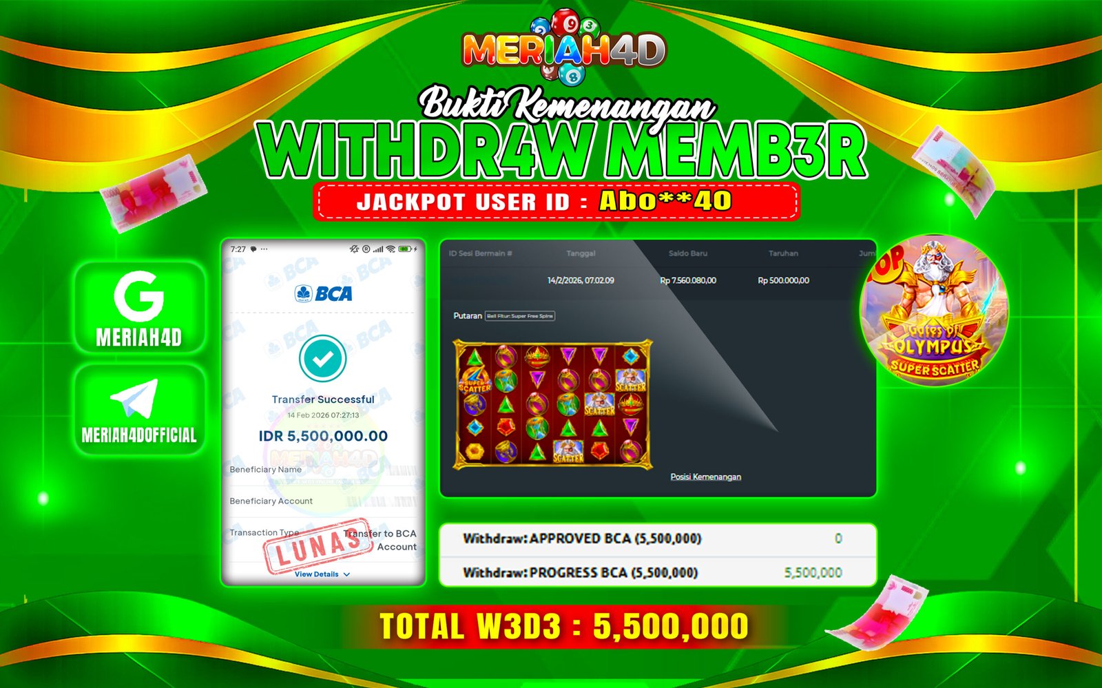 Selamat Kepada ID : ABO**40 Atas Withdraw Rp. 5.500.000 Juta Hari ini. Ditunggu Withdraw Selanjutnya dan ajak juga teman temannya bergabung di Meriah4d