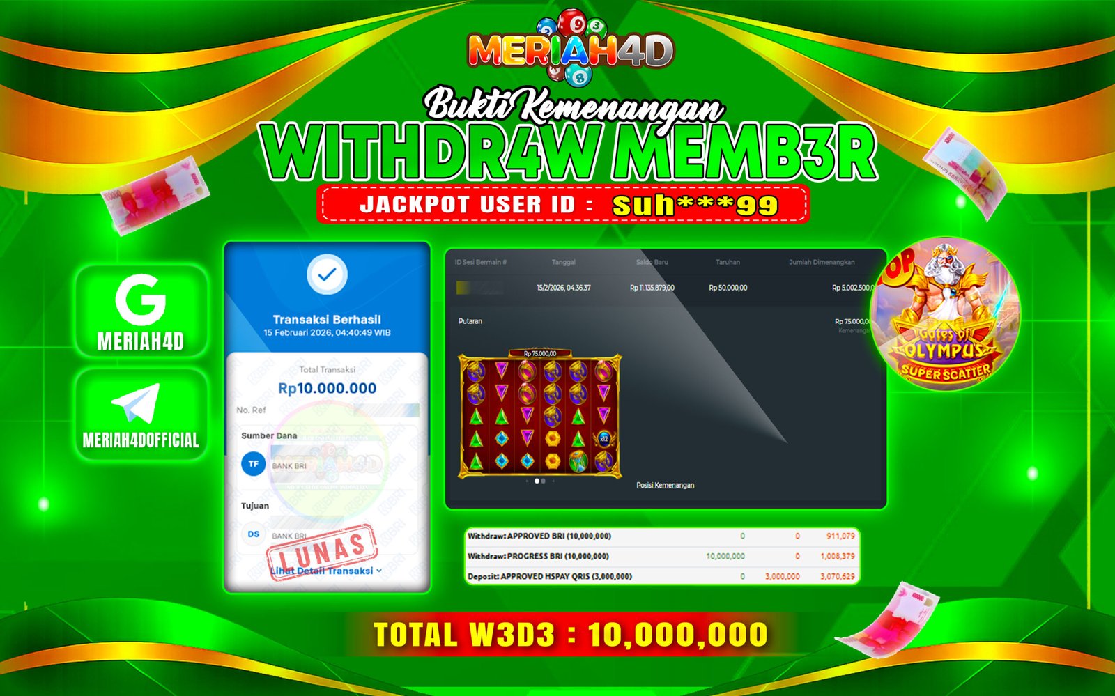 Selamat Kepada ID : SUH**99 Atas Withdraw Rp. 10.000.000 Juta Hari ini. Ditunggu Withdraw Selanjutnya dan ajak juga teman temannya bergabung di Meriah4d