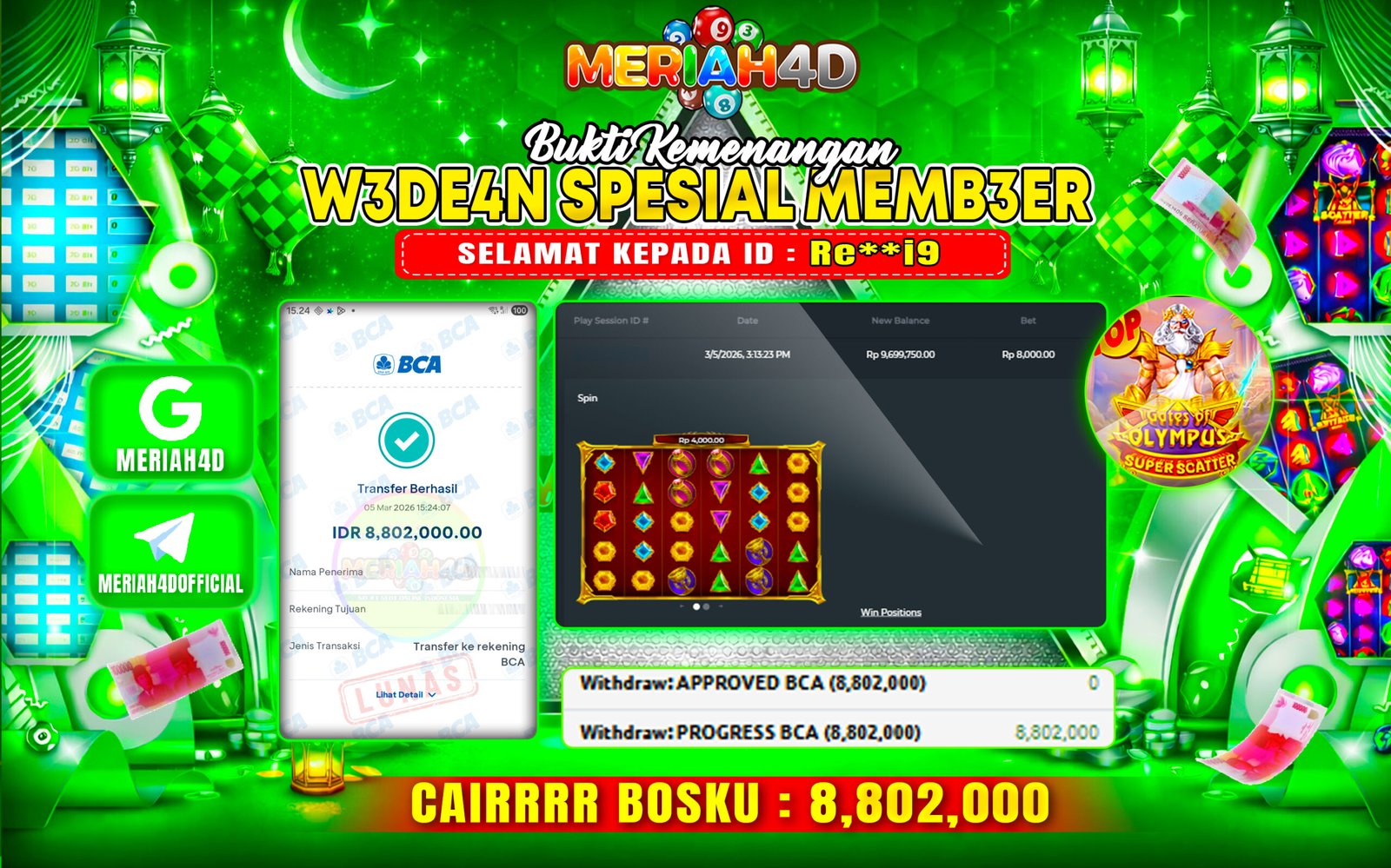 Selamat Kepada ID : RE**I9 Atas Withdraw Rp. 8.802.000 Juta Hari ini. Ditunggu Withdraw Selanjutnya dan ajak juga teman temannya bergabung di Meriah4d