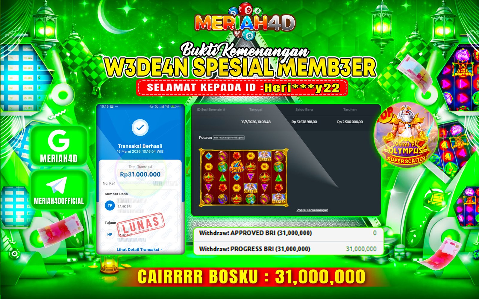 Selamat Kepada ID : Heri***y22 Atas Withdraw Rp. 31.000.000 Juta Hari ini. Ditunggu Withdraw Selanjutnya dan ajak juga teman temannya bergabung di Meriah4d