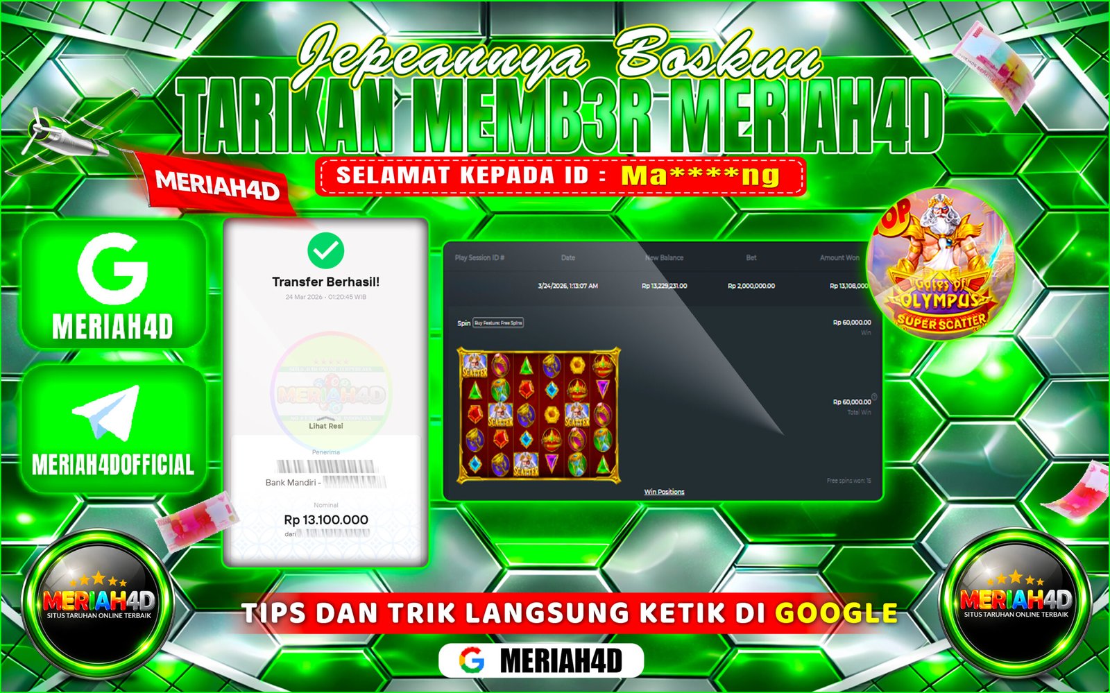 Selamat Kepada ID : MA*****NG Atas Withdraw Rp. 13.100.000 Juta Hari ini. Ditunggu Withdraw Selanjutnya dan ajak juga teman temannya bergabung di Meriah4d