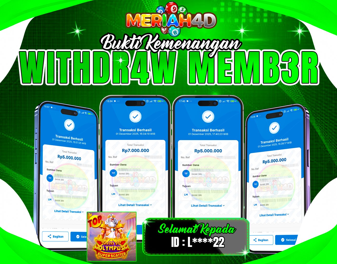 Selamat Kepada ID : L*******22 Atas Withdraw Rp. 22.000.000 Juta Hari ini. Ditunggu Withdraw Selanjutnya dan ajak juga teman temannya bergabung di Meriah4d