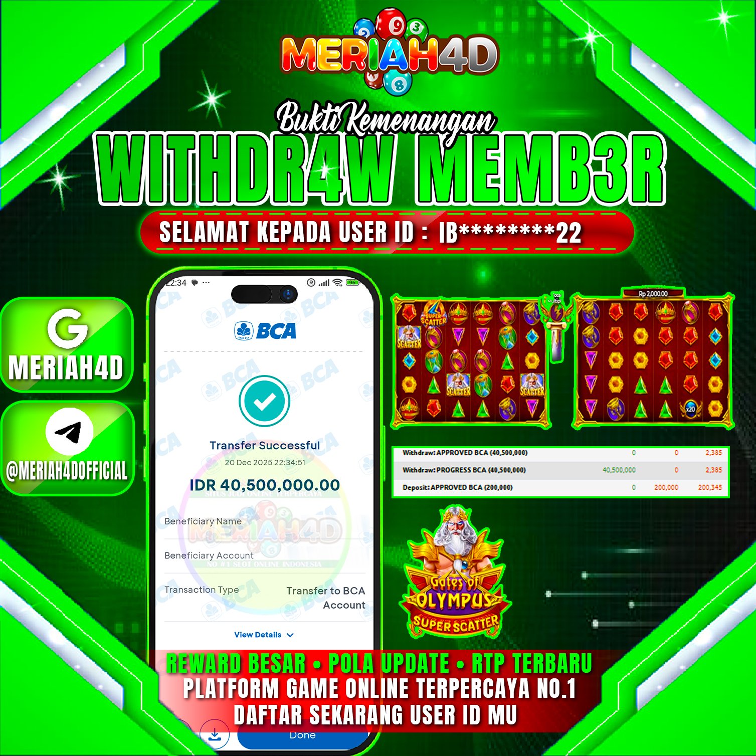 Selamat Kepada ID : IB******22 Atas Withdraw Rp. 40.500.000 Juta Hari ini. Ditunggu Withdraw Selanjutnya dan ajak juga teman temannya bergabung di Meriah4d