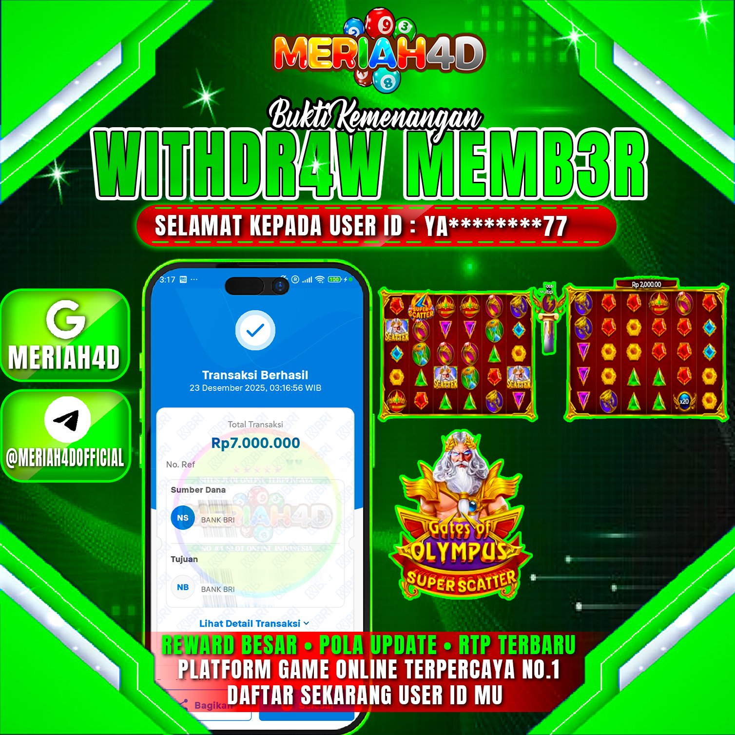 Selamat Kepada ID : YA******77 Atas Withdraw Rp. 7.000.000 Juta Hari ini. Ditunggu Withdraw Selanjutnya dan ajak juga teman temannya bergabung di Meriah4d