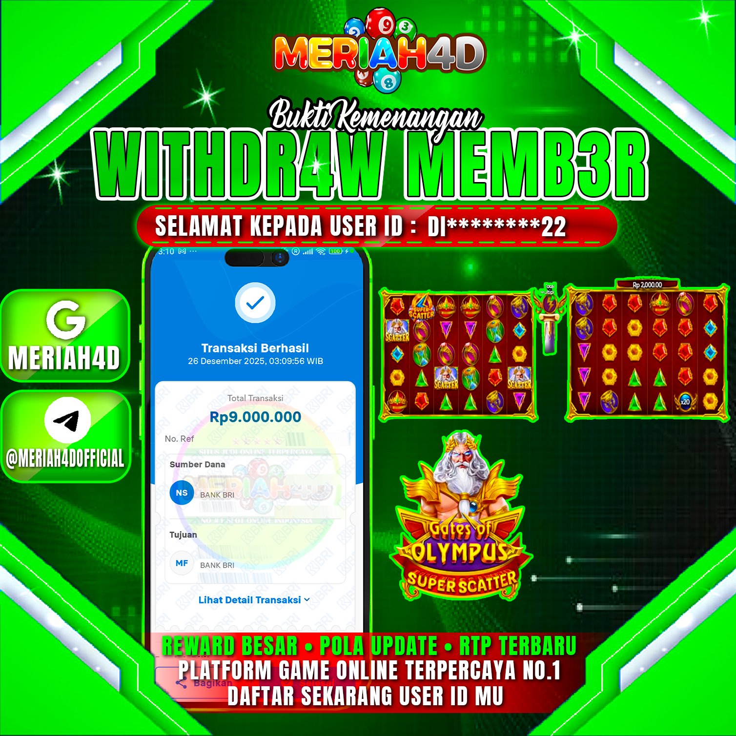 Selamat Kepada ID : DI*****22 Atas Withdraw Rp. 9.000.000 Juta Hari ini. Ditunggu Withdraw Selanjutnya dan ajak juga teman temannya bergabung di Meriah4d