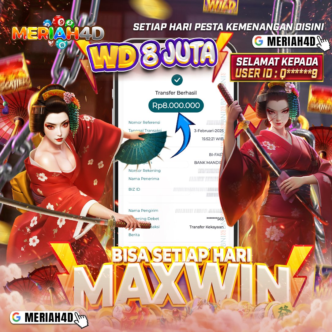Selamat Kepada ID : Q******9 Atas Withdraw Rp. 8.000.000 Juta Hari ini. Ditunggu Withdraw Selanjutnya dan ajak juga teman temannya bergabung di Meriah4d