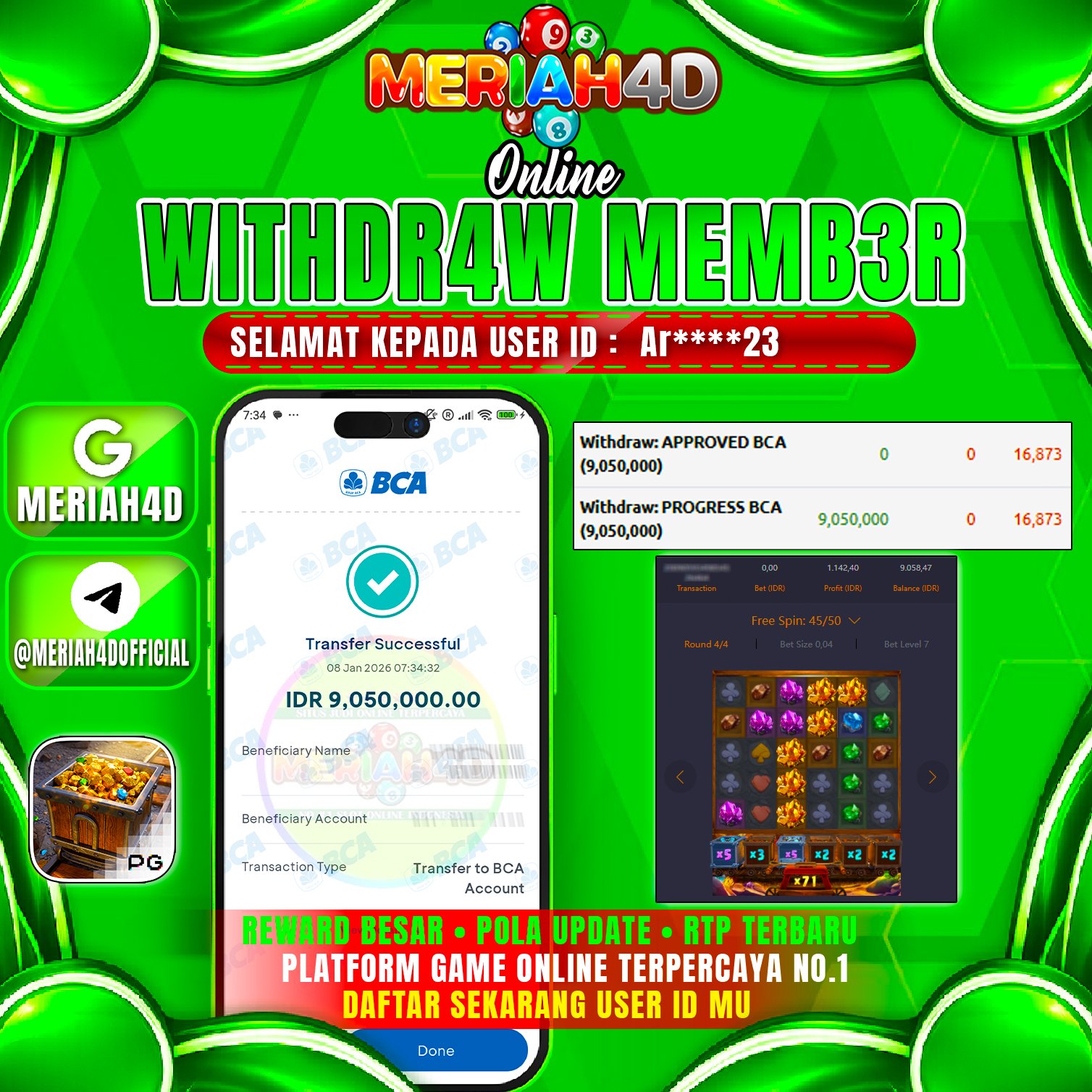 Selamat Kepada Id : Ar****23 Atas Withdraw Rp. 9.050.000 Juta Hari ini. Ditunggu Withdraw Selanjutnya dan ajak juga teman temannya bergabung di Meriah4d