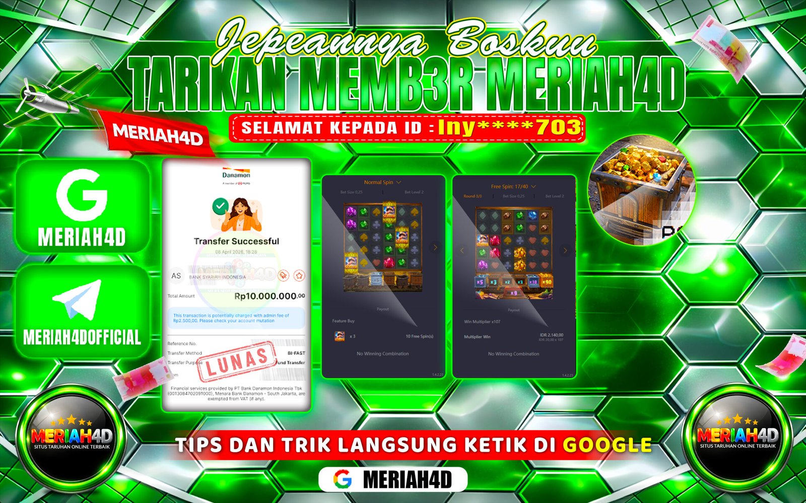 Selamat Kepada ID : Iny****703 Atas Withdraw Rp. 10.000.000 Juta Hari ini. Ditunggu Withdraw Selanjutnya dan ajak juga teman temannya bergabung di Meriah4d