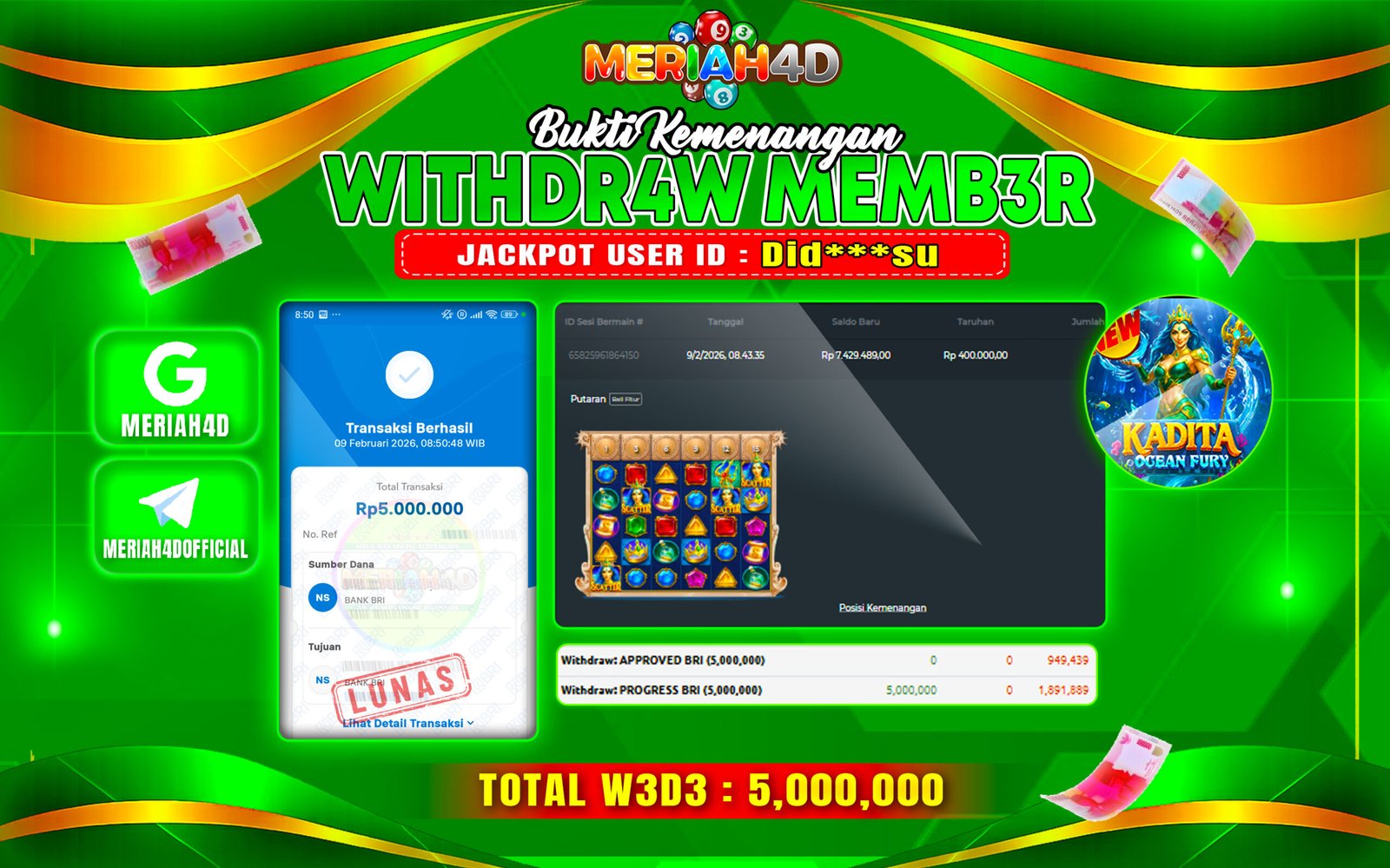 Selamat Kepada ID : DID***SU Atas Withdraw Rp. 5.000.000 Juta Hari ini. Ditunggu Withdraw Selanjutnya dan ajak juga teman temannya bergabung di Meriah4d