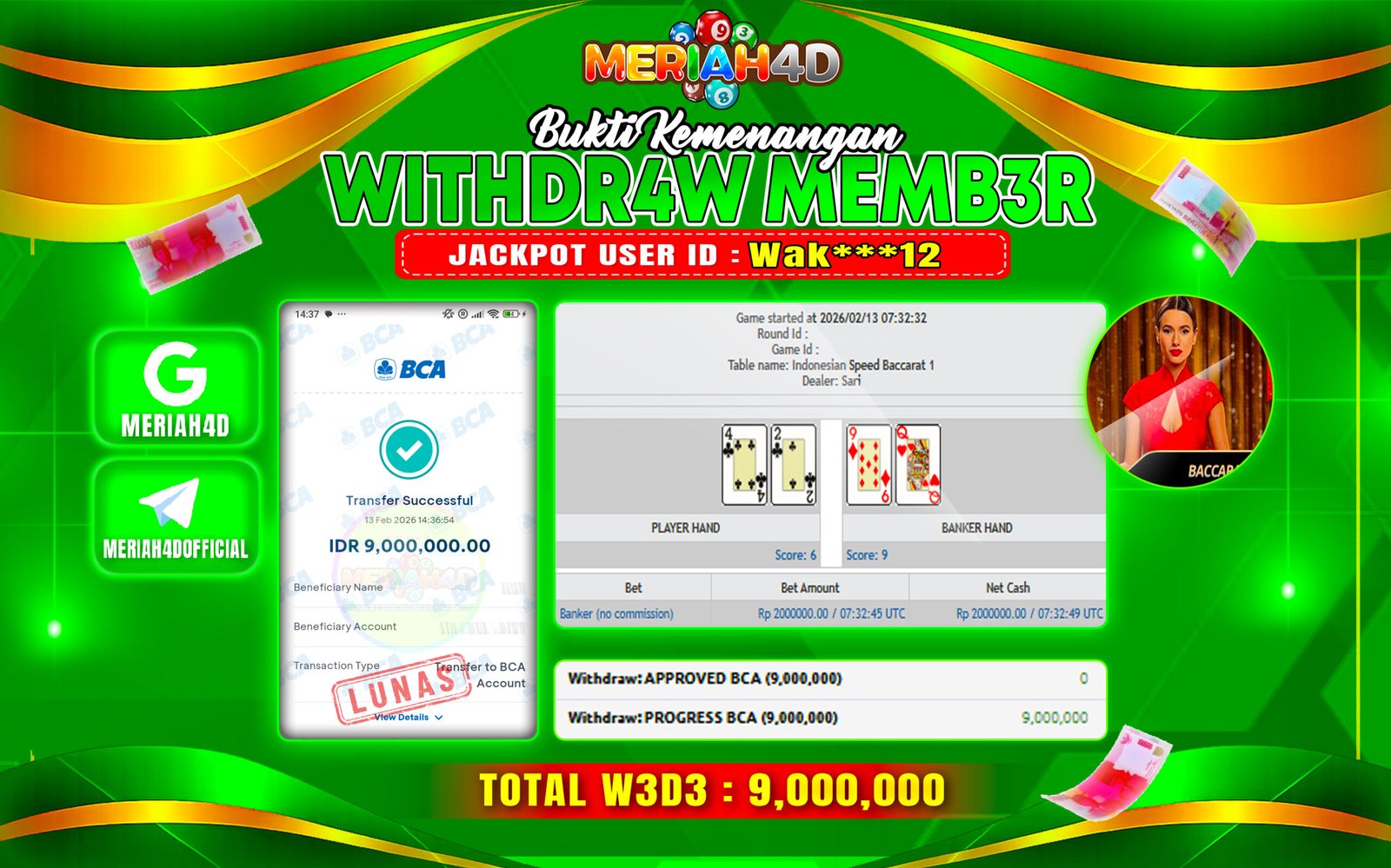 Selamat Kepada ID : WAK***12 Atas Withdraw Rp. 9.000.000 Juta Hari ini. Ditunggu Withdraw Selanjutnya dan ajak juga teman temannya bergabung di Meriah4d