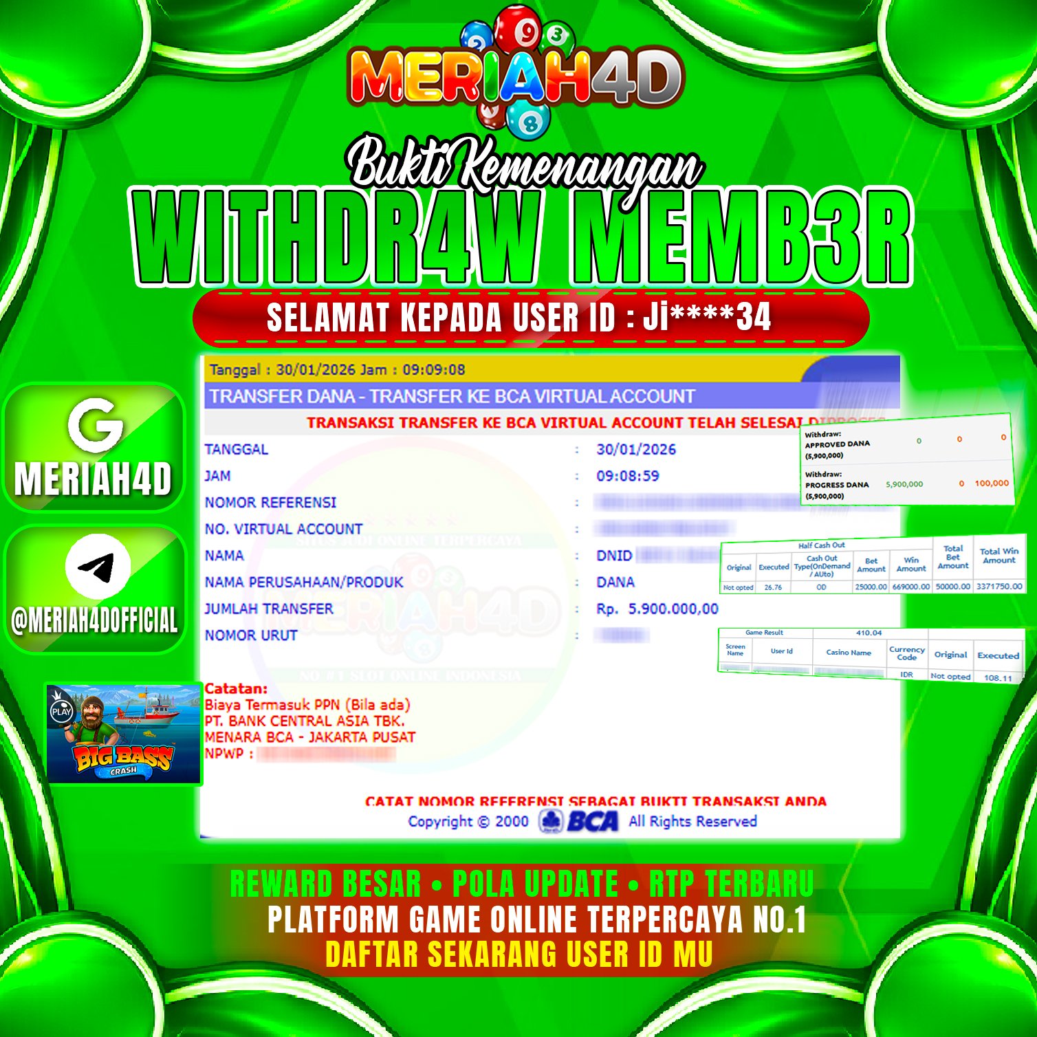 Selamat Kepada ID : JI****34 Atas Withdraw Rp. 5.900.000 Juta Hari ini. Ditunggu Withdraw Selanjutnya dan ajak juga teman temannya bergabung di Meriah4d