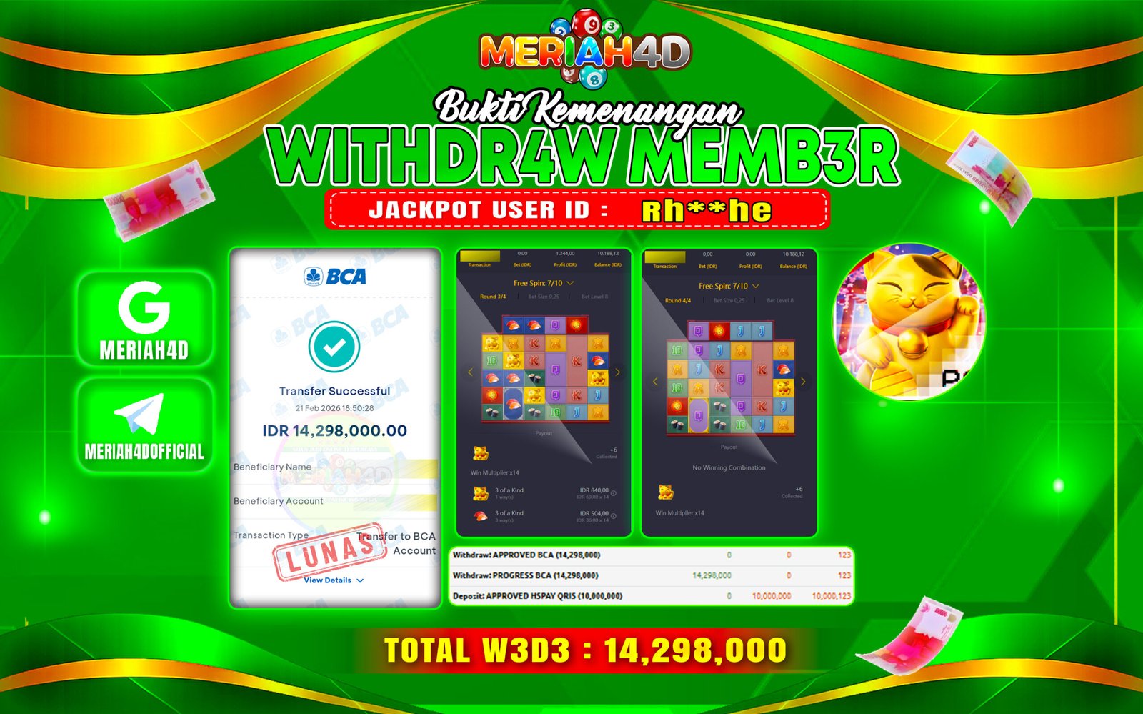 Selamat Kepada ID : RH****HE Atas Withdraw Rp. 14.298.000 Juta Hari ini. Ditunggu Withdraw Selanjutnya dan ajak juga teman temannya bergabung di Meriah4d