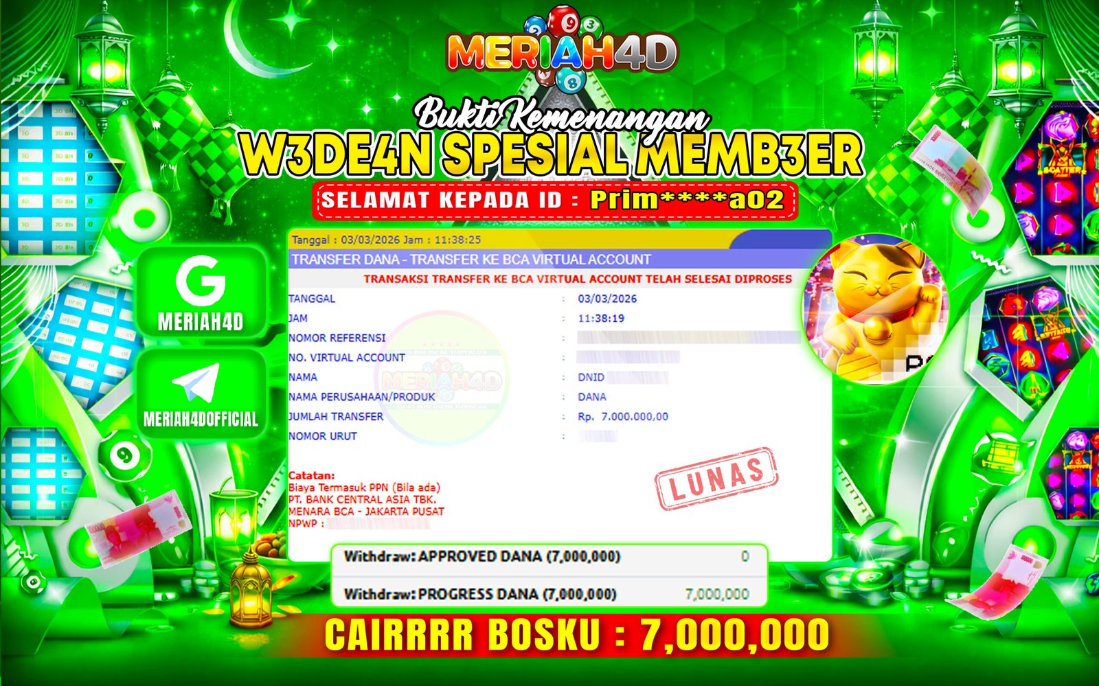 Selamat Kepada ID : PRIM****A02 Atas Withdraw Rp. 7.000.000 Juta Hari ini. Ditunggu Withdraw Selanjutnya dan ajak juga teman temannya bergabung di Meriah4d