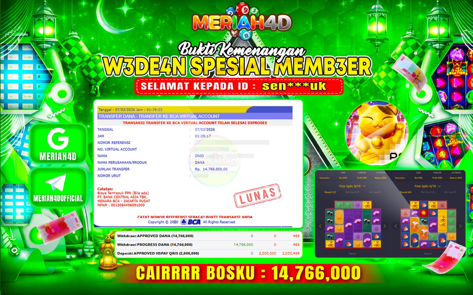 Selamat Kepada ID : SEN****UK Atas Withdraw Rp. 14.766.000 Juta Hari ini. Ditunggu Withdraw Selanjutnya dan ajak juga teman temannya bergabung di Meriah4d