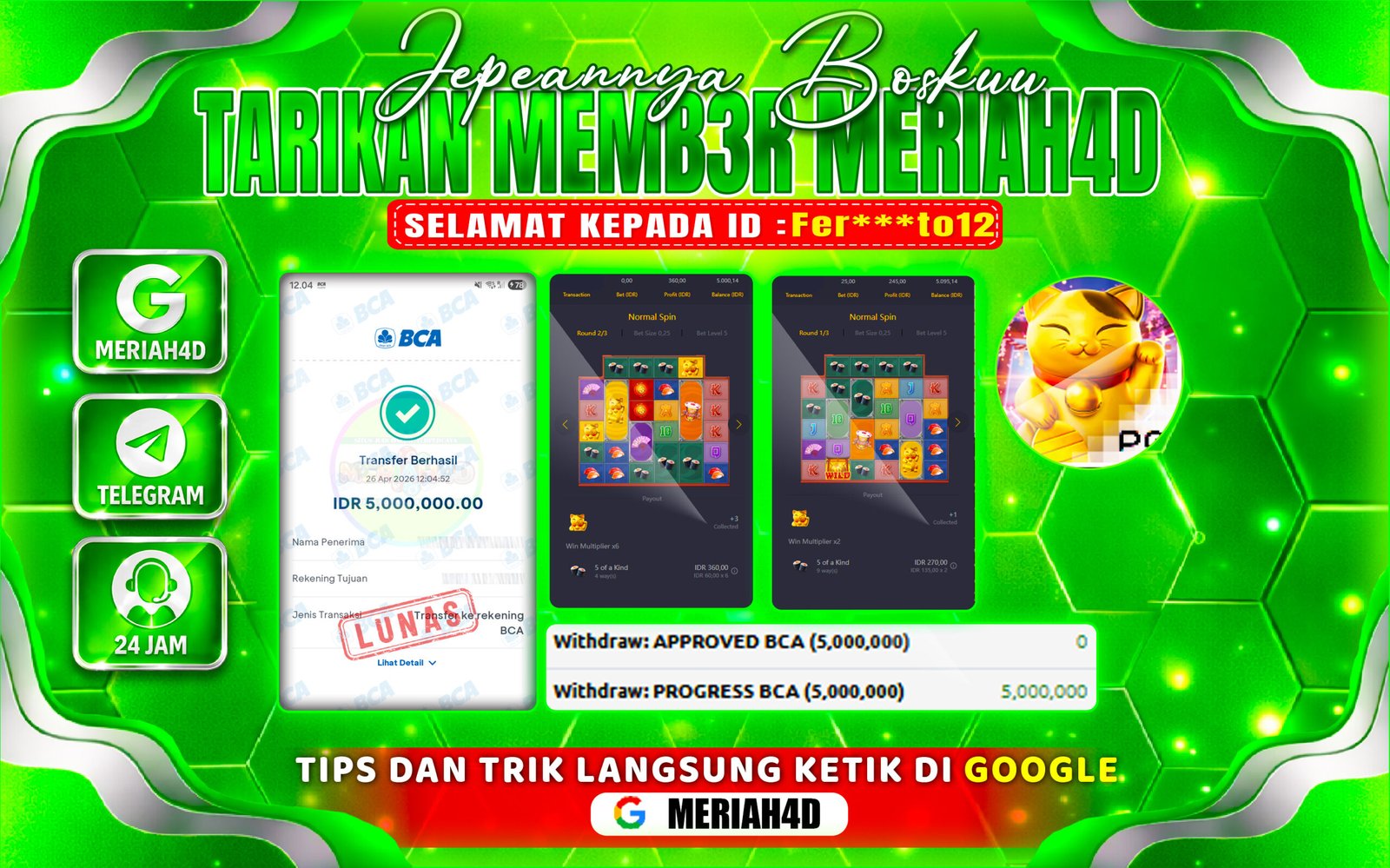 Selamat Kepada ID : Fer***to12 Atas Withdraw Rp. 5.000.000 Juta Hari ini. Ditunggu Withdraw Selanjutnya dan ajak juga teman temannya bergabung di Meriah4d