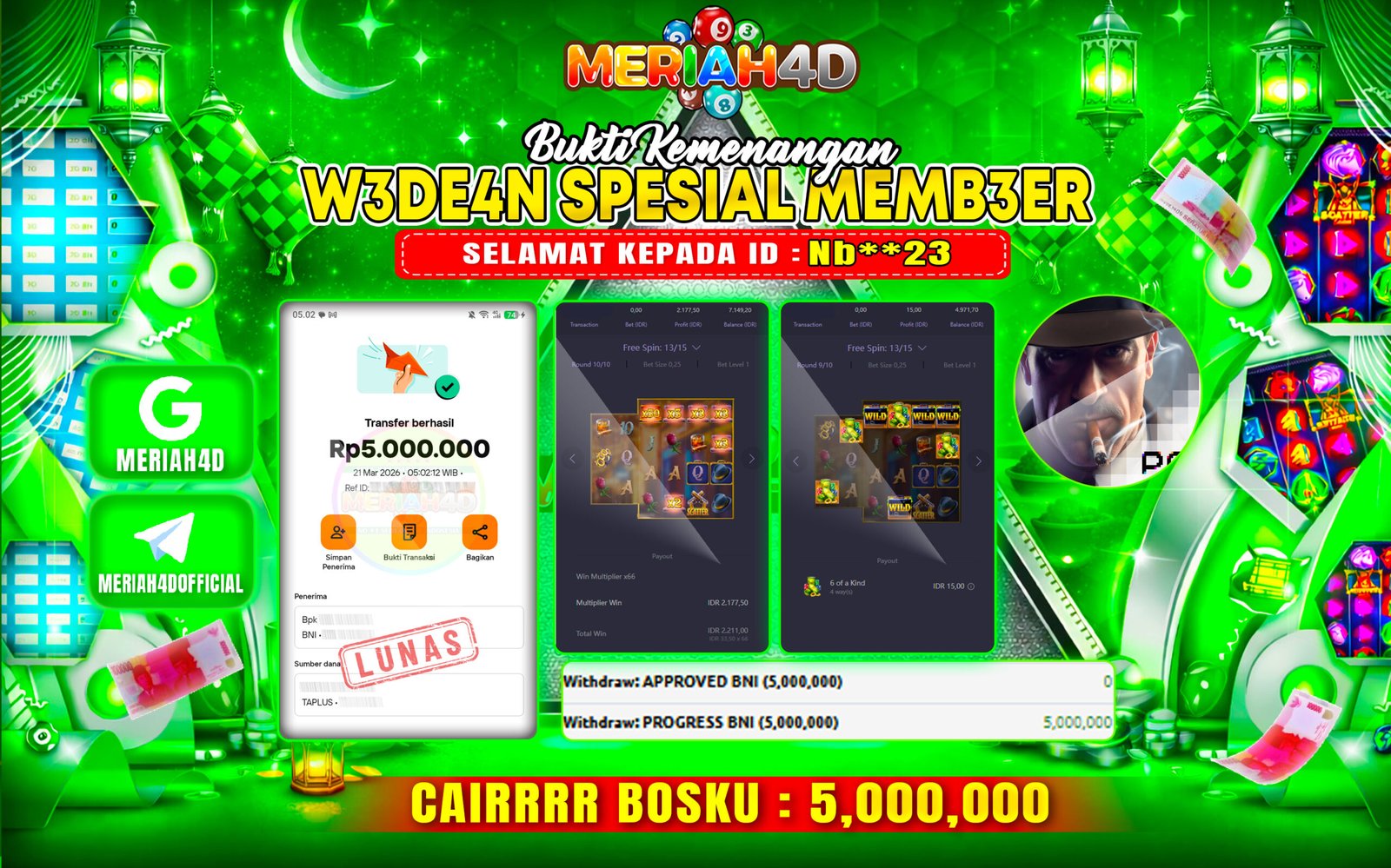 Selamat Kepada ID : Nb**23 Atas Withdraw Rp. 5.000.000 Juta Hari ini. Ditunggu Withdraw Selanjutnya dan ajak juga teman temannya bergabung di Meriah4d
