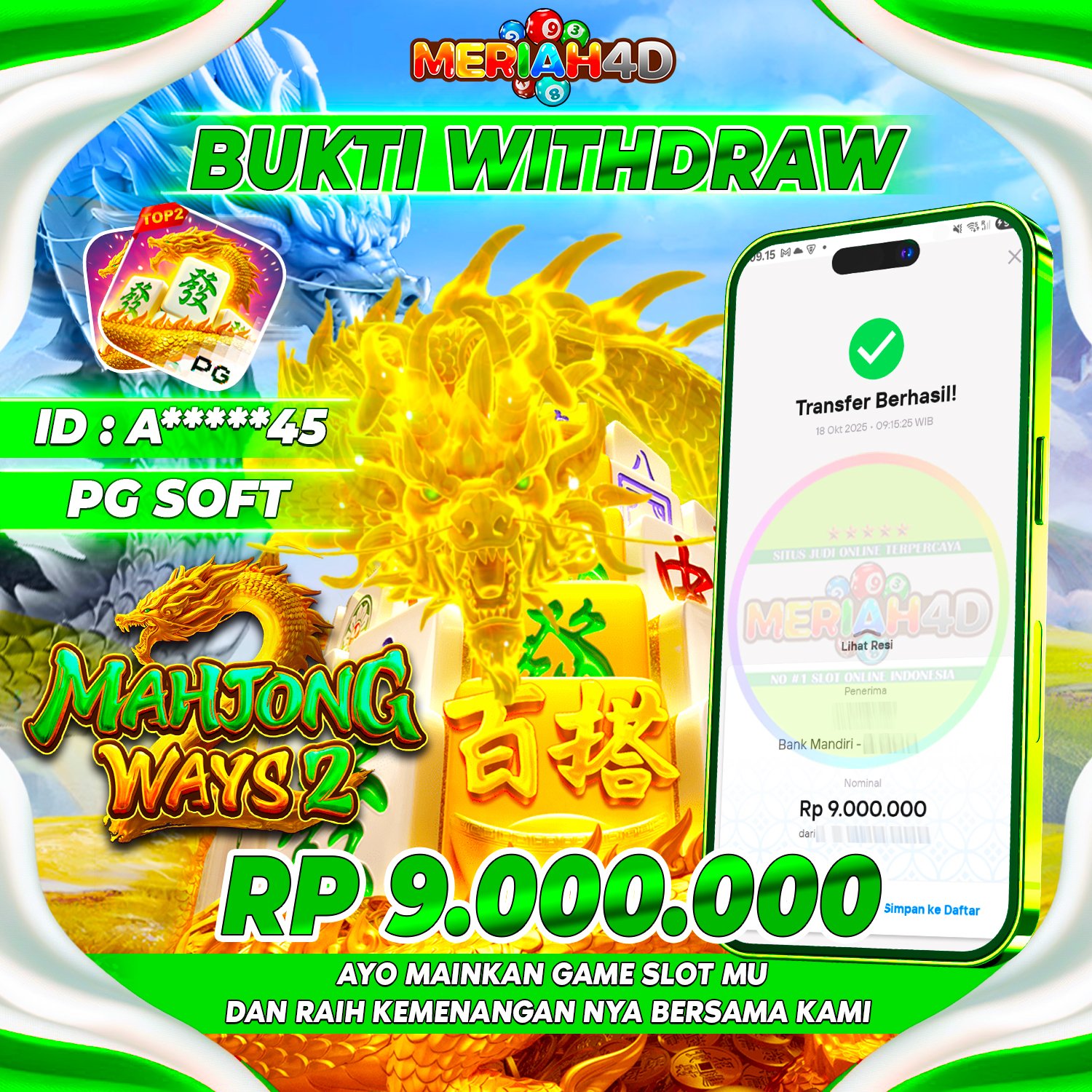 Selamat Kepada ID : A*****45 Atas Withdraw Rp. 9.000.000 Juta Hari ini. Ditunggu Withdraw Selanjutnya dan ajak juga teman temannya bergabung di Meriah4d