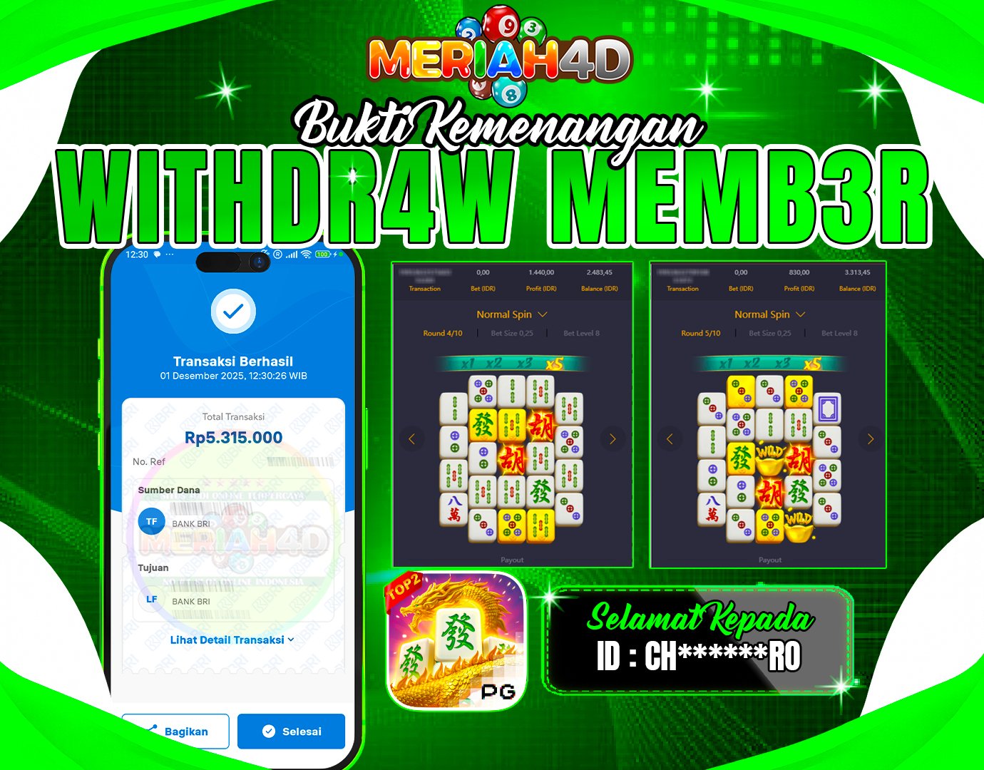 Selamat Kepada ID : CH*******RO Atas Withdraw Rp. 5.315.000 Juta Hari ini. Ditunggu Withdraw Selanjutnya dan ajak juga teman temannya bergabung di Meriah4d