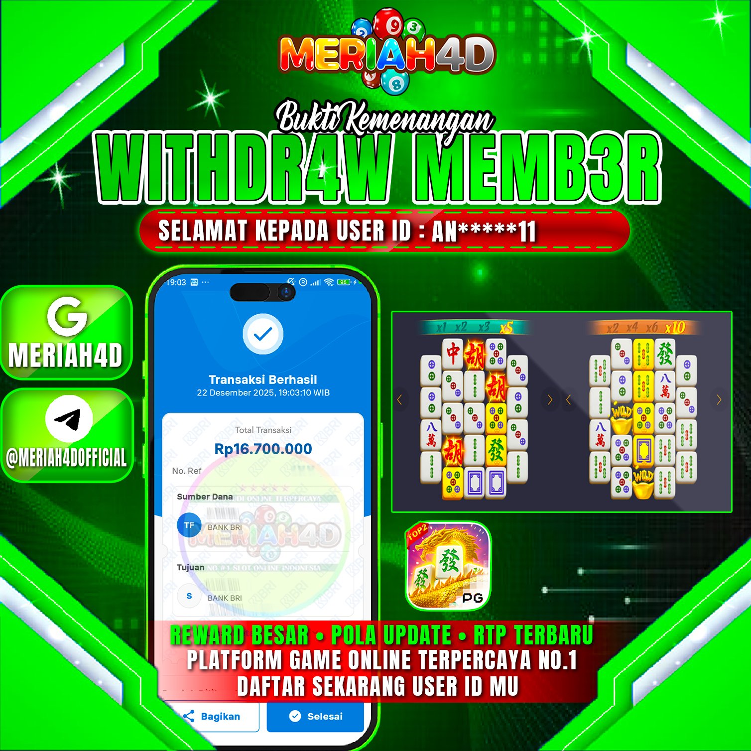 Selamat Kepada ID : AN******11 Atas Withdraw Rp. 16.700.000 Juta Hari ini. Ditunggu Withdraw Selanjutnya dan ajak juga teman temannya bergabung di Meriah4d