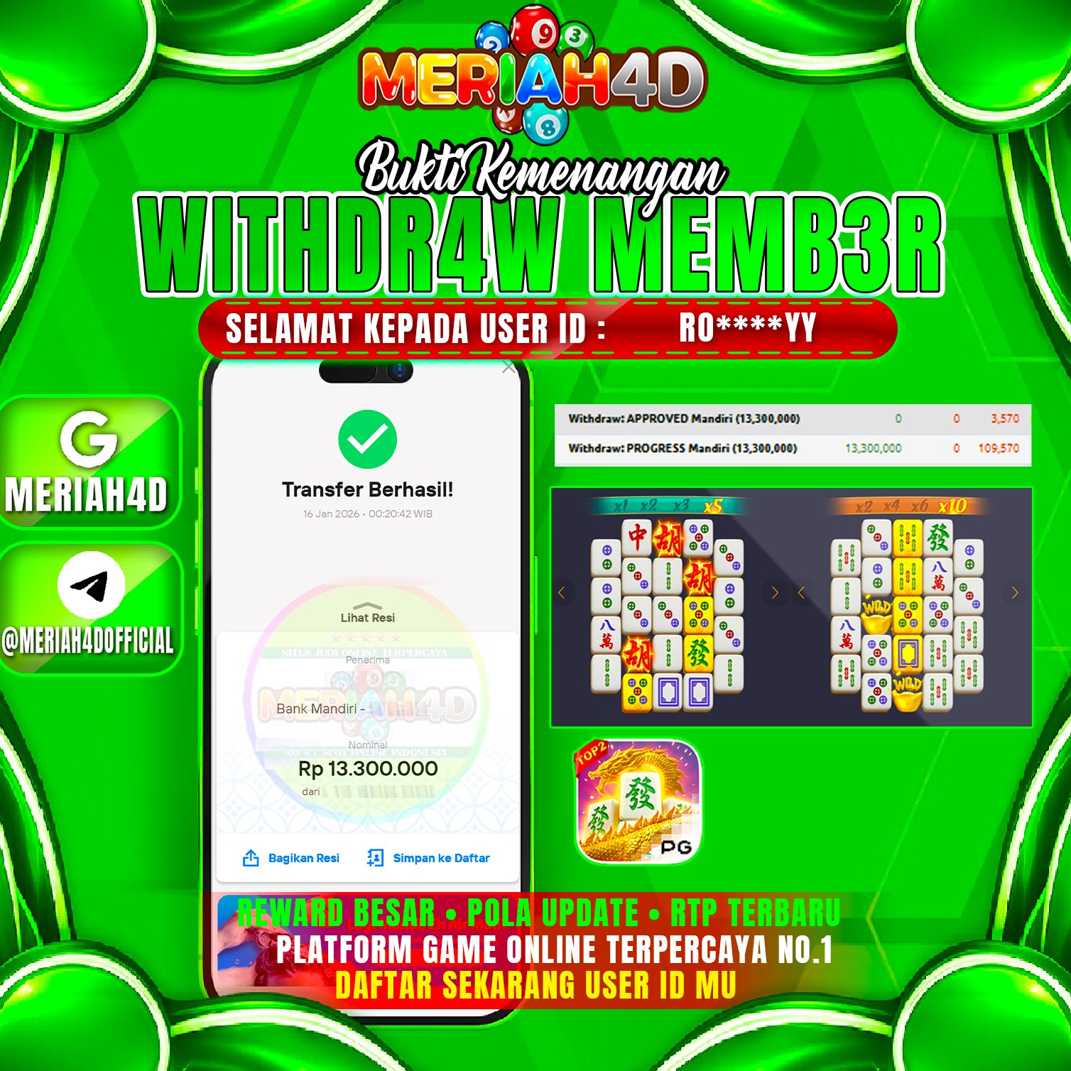 Selamat Kepada ID : RO*******YY Atas Withdraw Rp. 13.300.000 Juta Hari ini. Ditunggu Withdraw Selanjutnya dan ajak juga teman temannya bergabung di Meriah4d