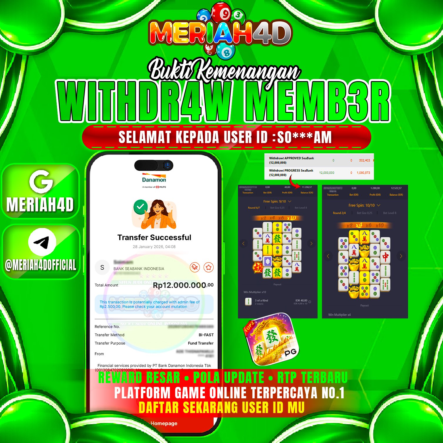 Selamat Kepada ID : SO******AM Atas Withdraw Rp. 12.000.000 Juta Hari ini. Ditunggu Withdraw Selanjutnya dan ajak juga teman temannya bergabung di Meriah4d