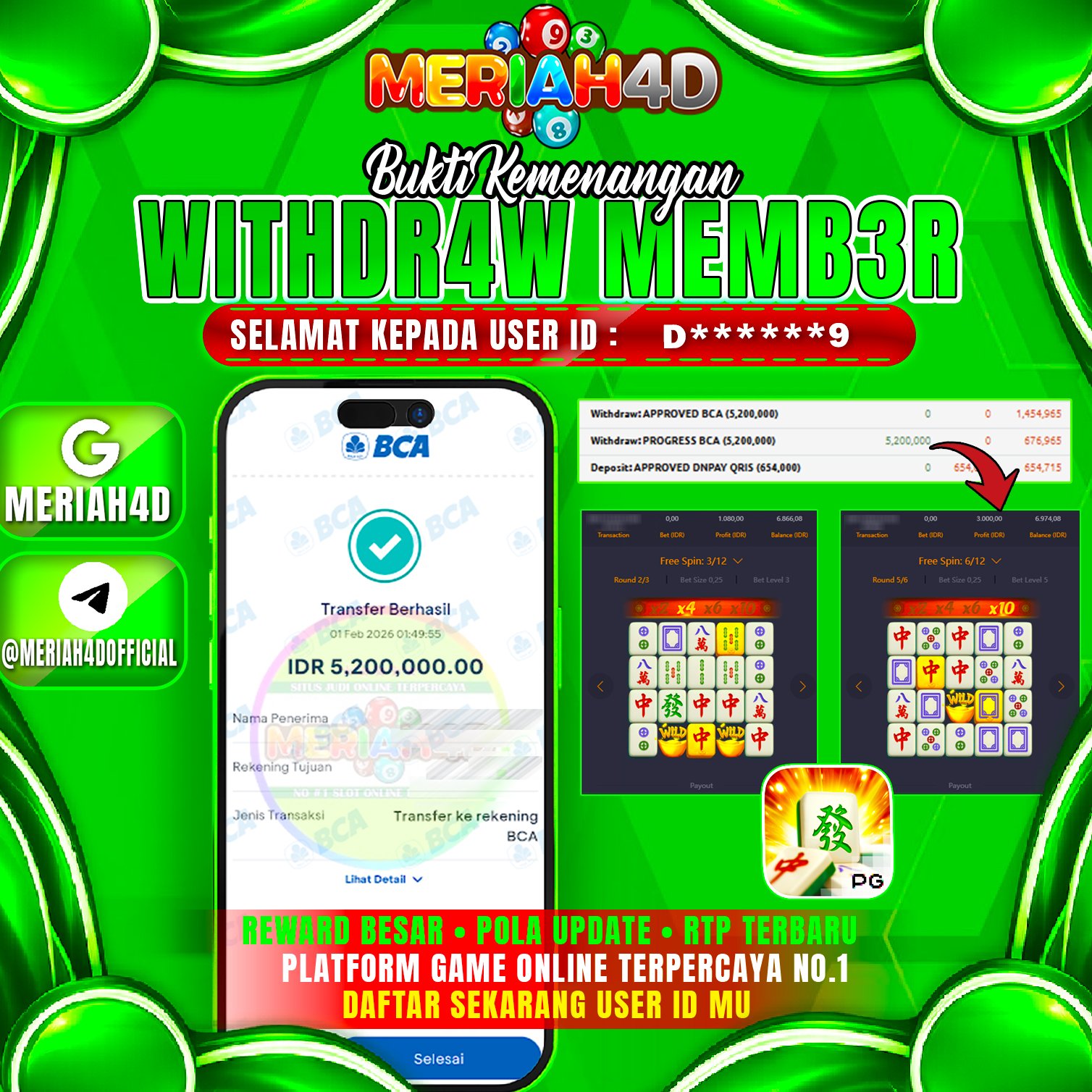Selamat Kepada ID : D******9 Atas Withdraw Rp. 5.200.000 Juta Hari ini. Ditunggu Withdraw Selanjutnya dan ajak juga teman temannya bergabung di Meriah4d