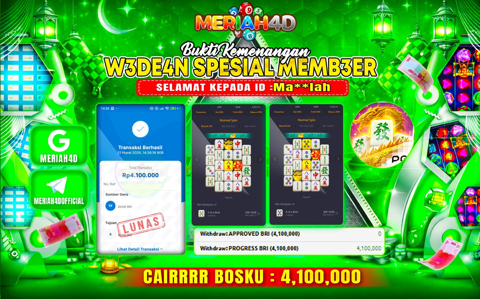 Selamat Kepada ID : Ma**lah Atas Withdraw Rp. 4.100.000 Juta Hari ini. Ditunggu Withdraw Selanjutnya dan ajak juga teman temannya bergabung di Meriah4d