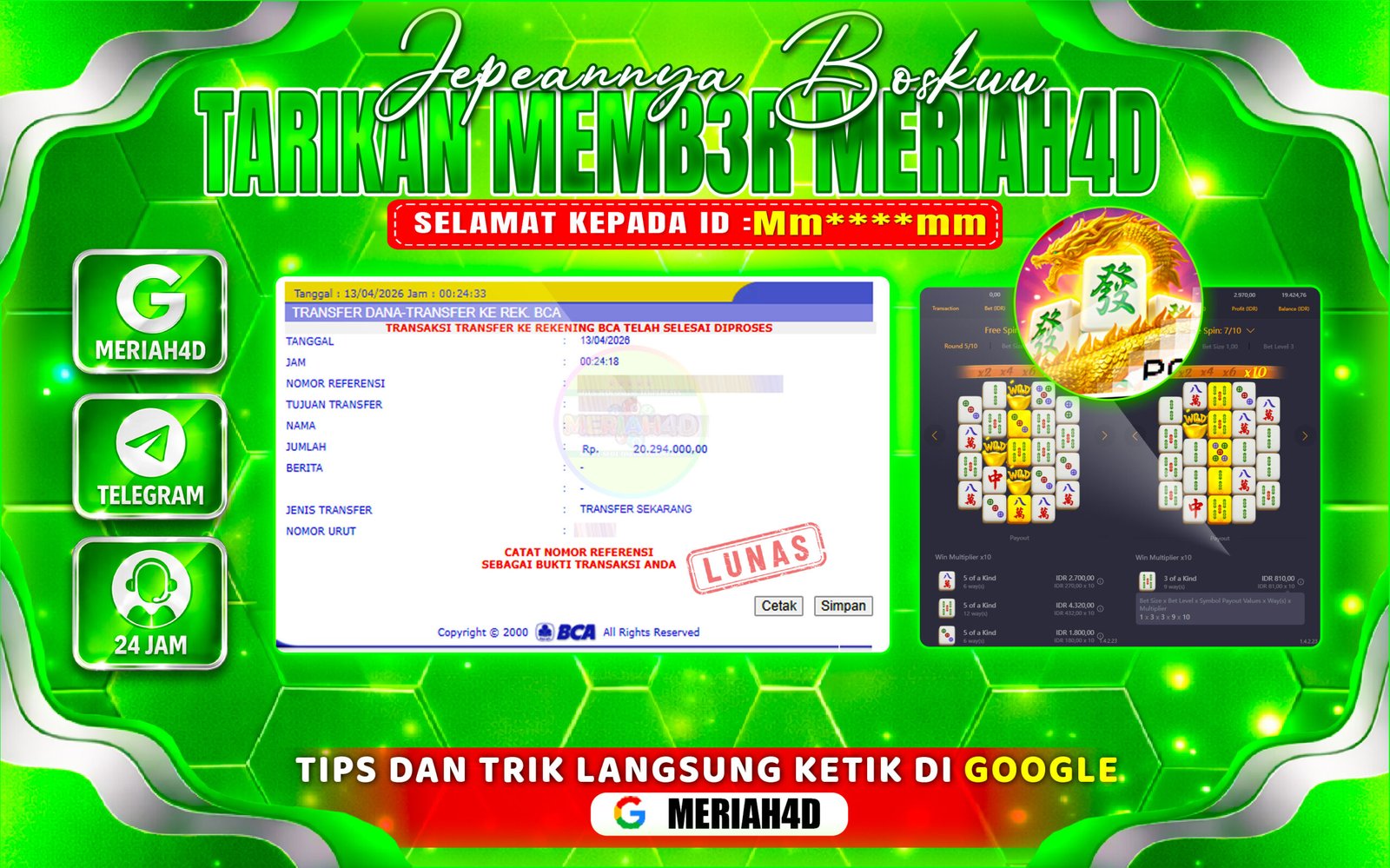 Selamat Kepada ID : M***mm Atas Withdraw Rp. 20.294.000 Juta Hari ini. Ditunggu Withdraw Selanjutnya dan ajak juga teman temannya bergabung di Meriah4d