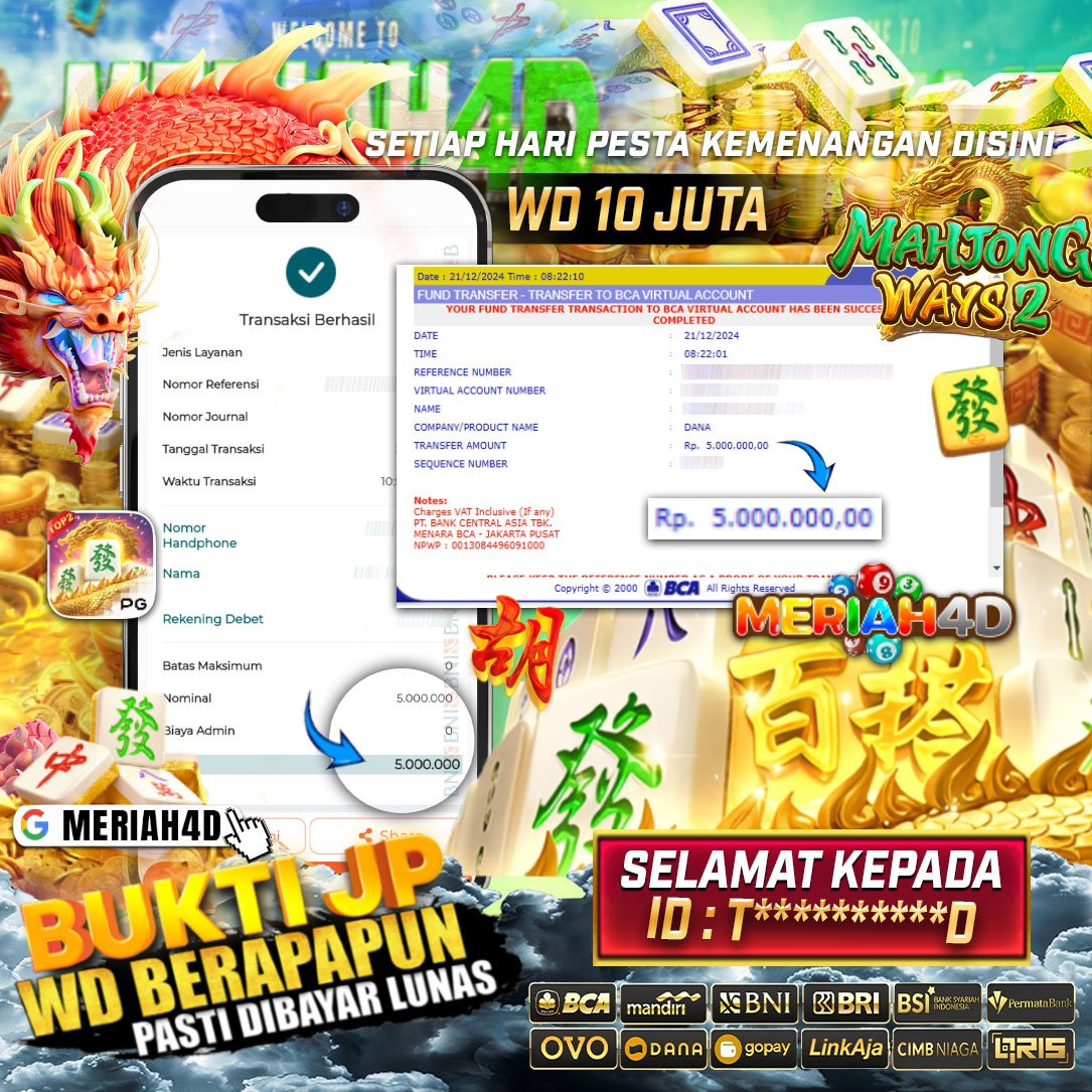 Selamat Kepada ID : T*****D Atas Withdraw Rp. 10.000.000 Juta Hari ini. Ditunggu Withdraw Selanjutnya dan ajak juga teman temannya bergabung di Meriah4d