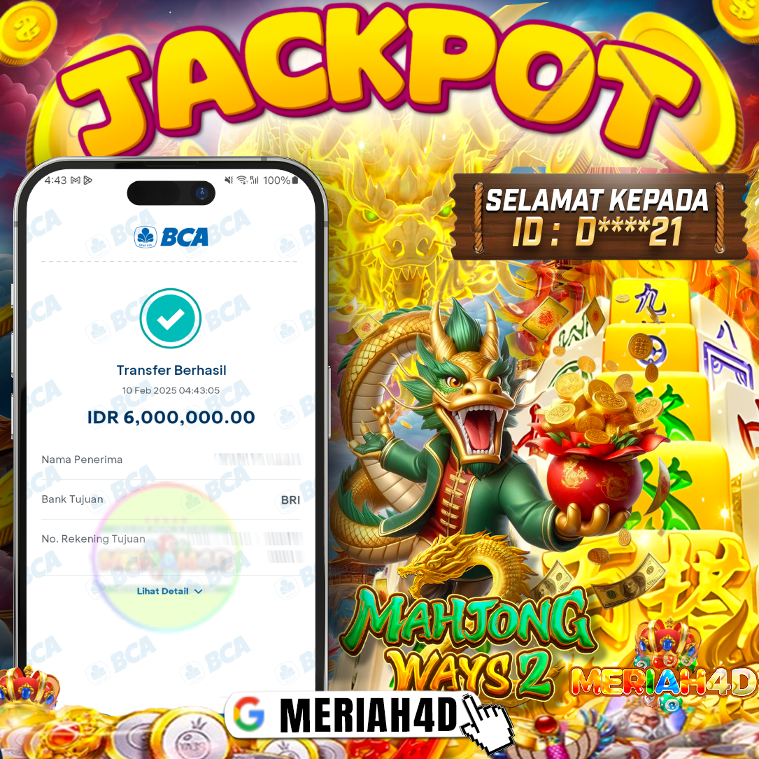 Selamat Kepada ID : D****21 Atas Withdraw Rp. 6.000.000 Juta Hari ini. Ditunggu Withdraw Selanjutnya dan ajak juga teman temannya bergabung di Meriah4d