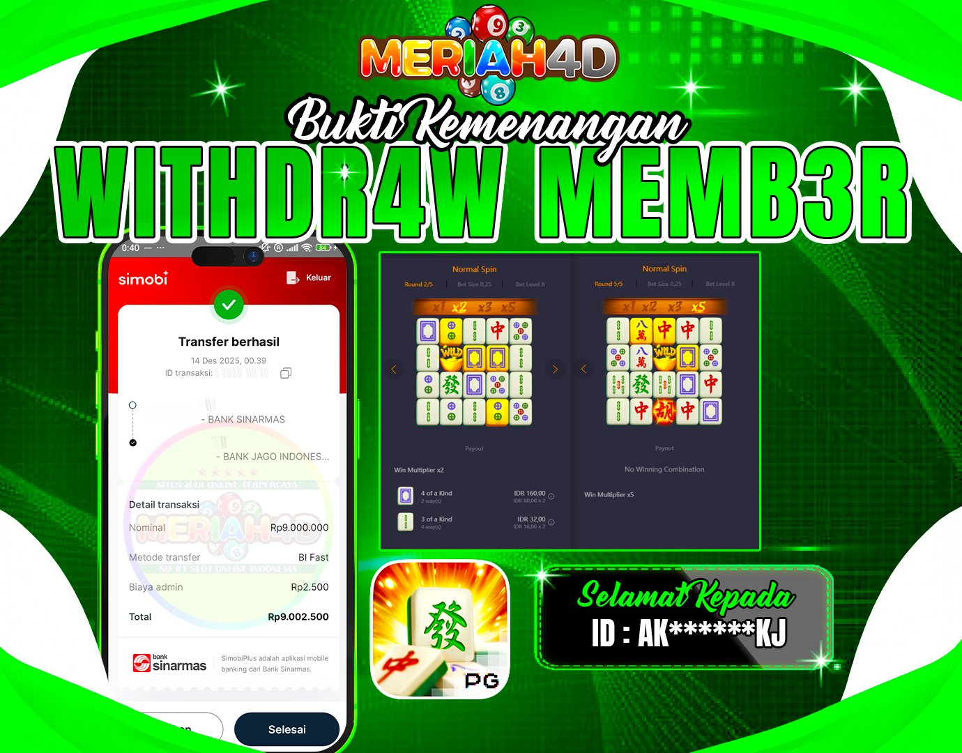 Selamat Kepada ID : AK*******KJ Atas Withdraw Rp. 9.000.000 Juta Hari ini. Ditunggu Withdraw Selanjutnya dan ajak juga teman temannya bergabung di Meriah4d